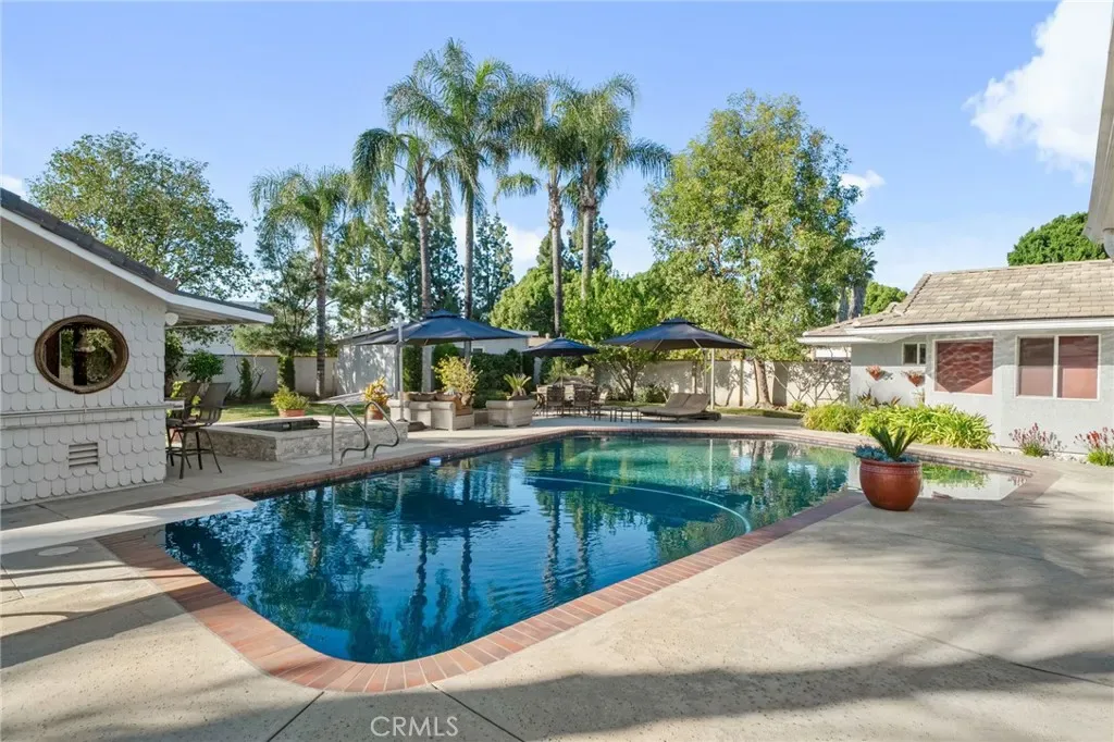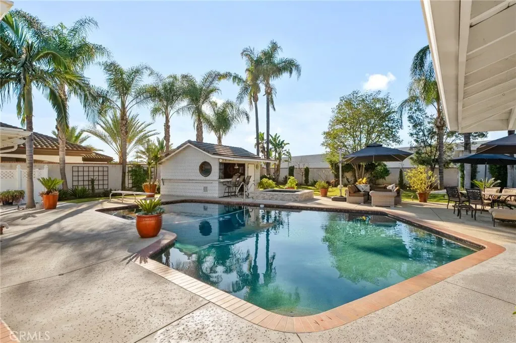 The home features a wet bar, workout room, sunroom, and a game room that could easily be converted into a separate ADU with its own entrance. The expansive primary suite overlooks the pool and backyard and includes a large walk-in closet and a spa-like bathroom with a jacuzzi tub.