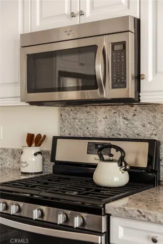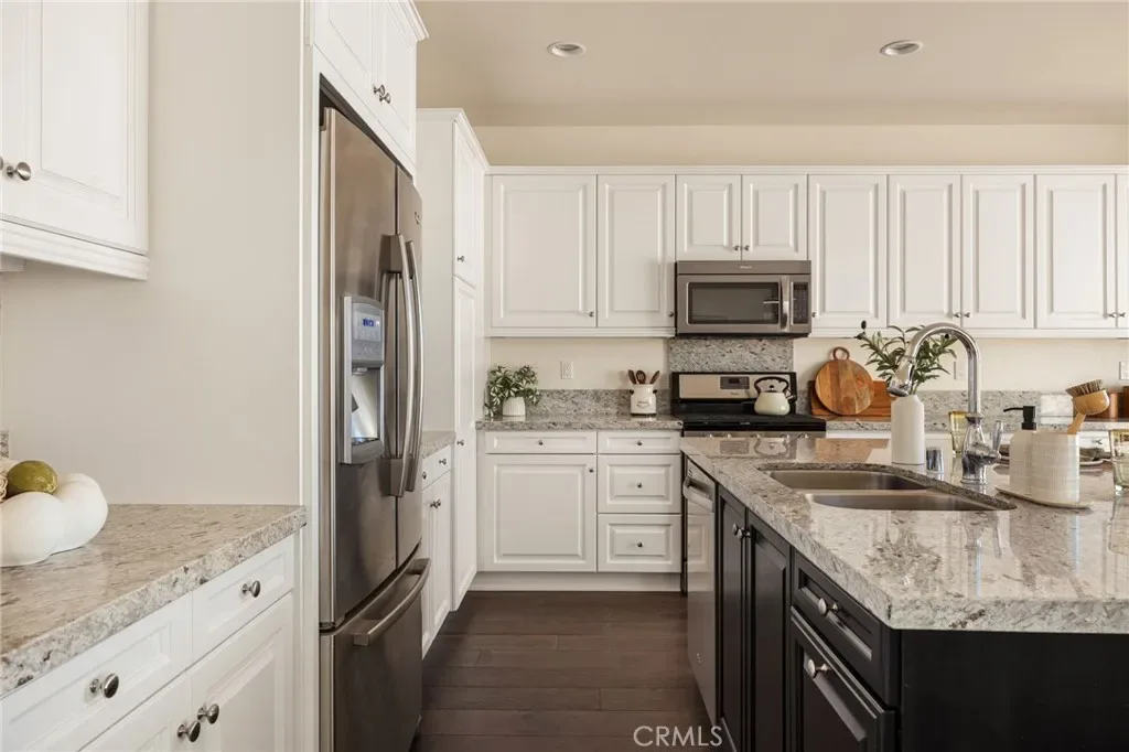 At the heart of the home, the kitchen blends style and function with granite countertops, white cabinetry, stainless steel appliances, and generous prep space. Large windows and sliding glass doors bring in natural light and lead to the backyard patio, creating an easy indoor-outdoor lifestyle.