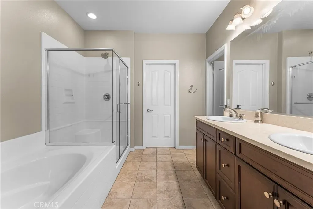 Upstairs, you’ll find dual primary suites, each with its own private bathroom—ideal for guests, roommates, or multi-generational living. The main primary suite features dual sinks, a soaking tub, separate shower, and a walk-in closet, creating a true retreat. A convenient upstairs laundry area adds to the home’s thoughtful design.