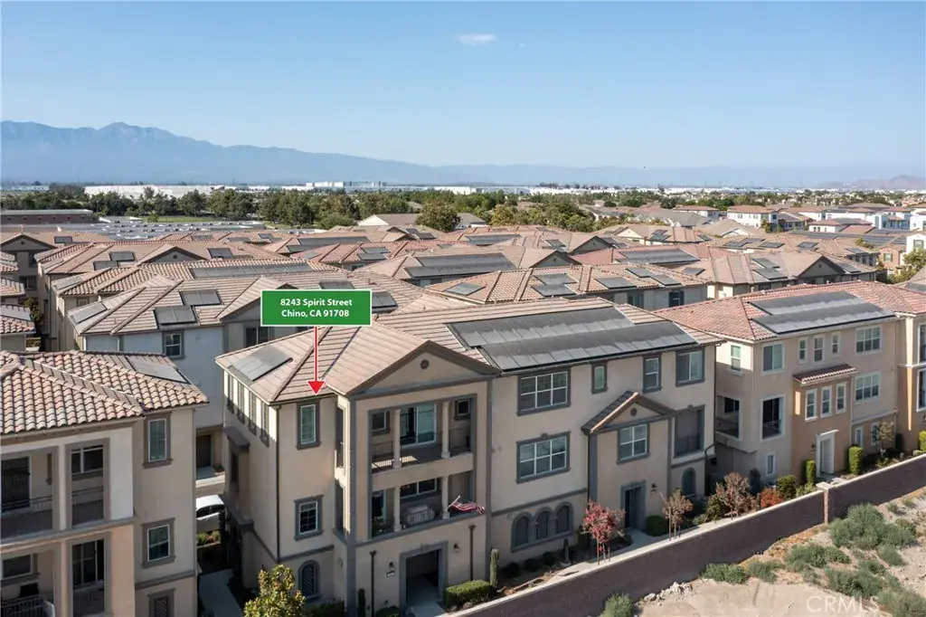 Located in the desirable Morning Sun collection by Lennar at The Preserve in Chino, 8243 Spirit Street is a modern condominium built in 2022 that offers the perfect blend of comfort, functionality, and convenience. This beautifully designed three-bedroom, two-bathroom home spans approximately 1,493 square feet and features a spacious open-concept layout that connects the living room, kitchen, and dining area, flowing effortlessly onto a private deck for indoor-outdoor living. Thoughtful features include central heating and air conditioning, a tankless water heater, walk-in closets, a breakfast bar, and a dedicated laundry room. The home also includes an attached two-car garage, paid-off solar panels, an EV charger, and essential appliances like a washer, dryer, and refrigerator, making it both energy-efficient and move-in ready. Nestled in a gated community, residents enjoy access to top-tier amenities such as a clubhouse, pool, spa, fitness center, tennis courts, sport courts, playgrounds, BBQ and picnic areas, meeting rooms, and scenic nature trails, with a monthly HOA. Conveniently located near Cal Aero Preserve Academy (K–8) and Chino Hills High School, and just a short drive to Los Angeles and Orange County, this home offers an ideal lifestyle for modern families.