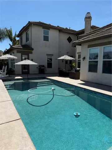 The fully landscaped yard with custom pool and patio that is perfect for entertaining and watching the sunset over the lake.