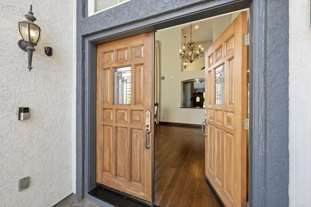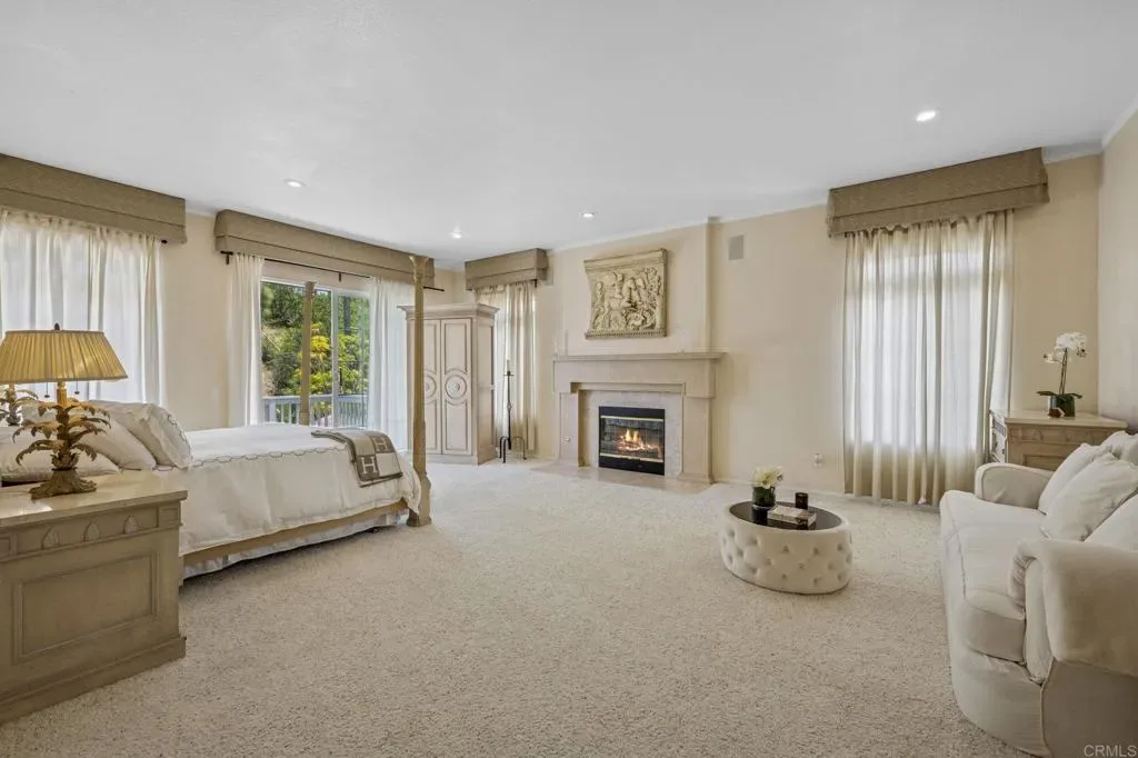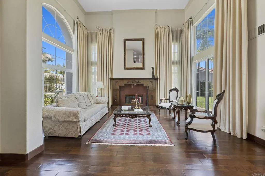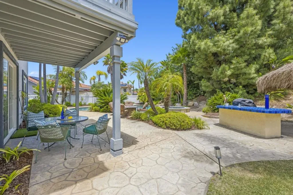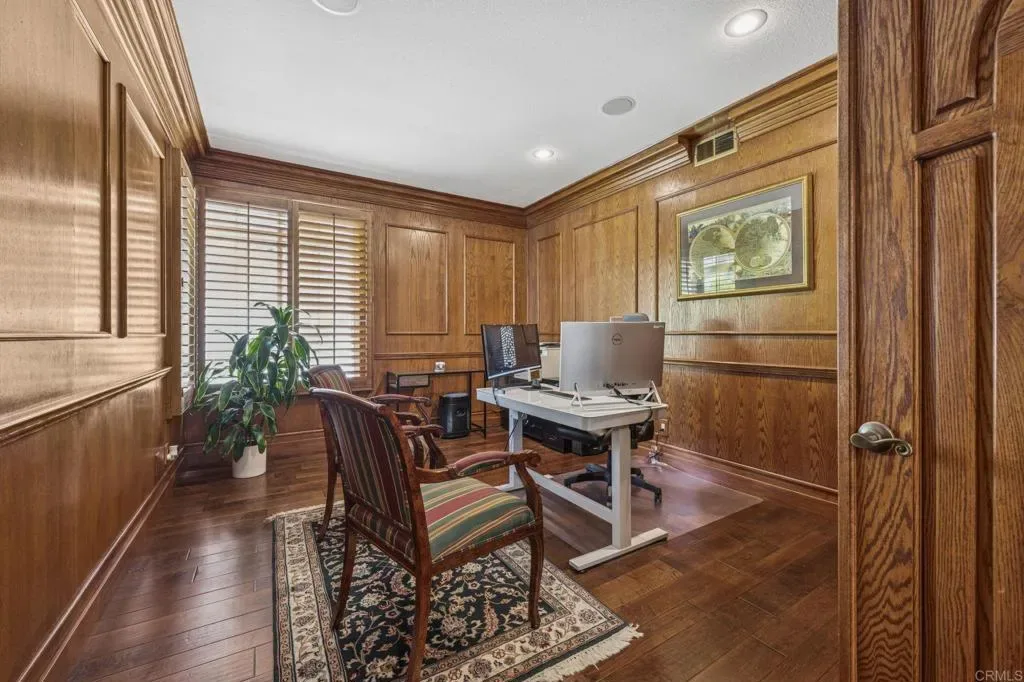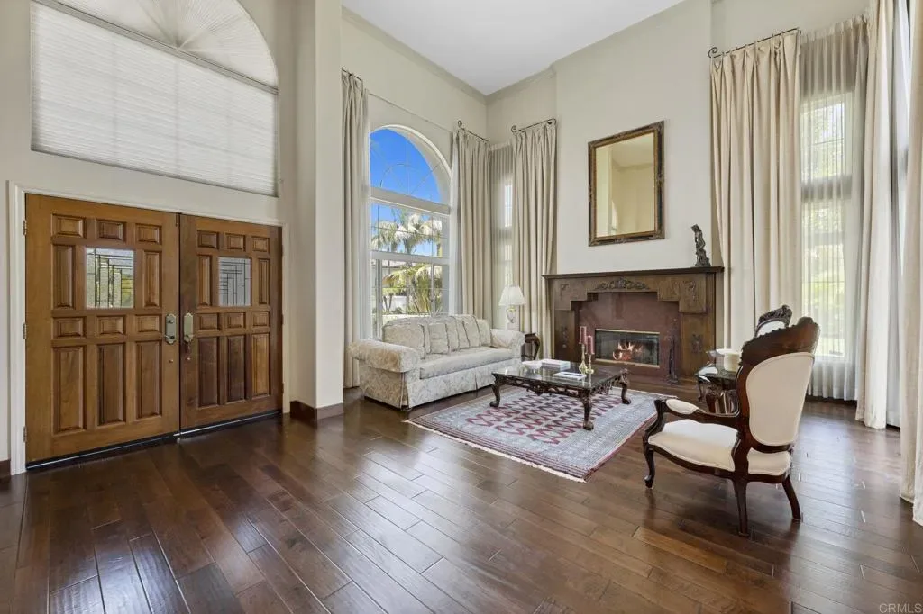 Welcome to a sanctuary of luxury in the heart of Rancho Del Rey, where every detail of this exquisite residence invites you to experience timeless elegance, serenity, and comfort. Spanning nearly 4,300 square feet, this stunning home features 5 spacious bedrooms and 4.5 beautifully appointed bathrooms, each fireplace crafted to blend refined style with everyday ease. Soaring ceilings, handcrafted fireplaces, and rich hardwood floors set a tone of quiet sophistication throughout the main living areas. At the center of the home, a gourmet kitchen awaits—wrapped in quartz countertops and equipped with premium appliances—perfectly designed for everything from Sunday brunch to intimate celebrations. The open layout flows naturally into a sunlit breakfast area and inviting family room, where memories are meant to be made. The primary suite is a private retreat, offering a fireplace, spa-like bathroom with jacuzzi tub, and his-and-hers walk-in closets. A wrap-around balcony overlooks the tranquil garden—ideal for morning coffee, golden sunsets, or watching full moons rise over the trees. A distinguished executive office, lined with custom wood paneling from floor to ceiling, offers a refined space for deep focus or creative flow. Outside, your own personal oasis unfolds: a refined and serene landscaped yard, built-in grill, and charming palapa set the stage for unforgettable outdoor entertaining or peaceful evenings under the stars. Solar panels, a whole-home water softener. NO HOA or Mello-Roos, this home offers not just beauty, but peace of mind. Just 20 minutes from downtown San Diego and the Mexican border