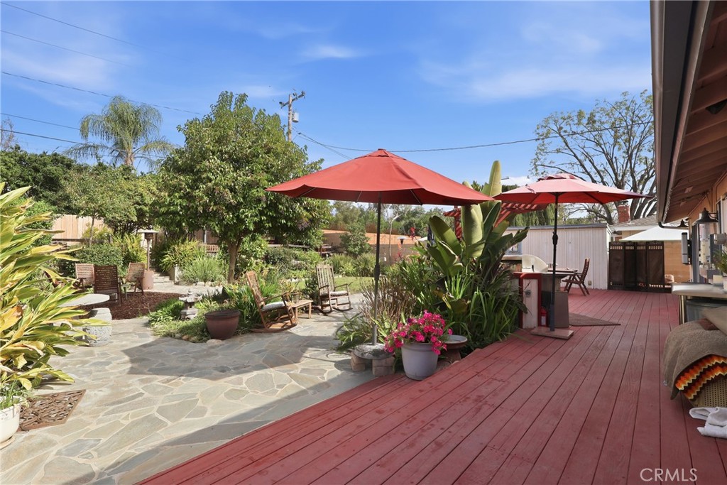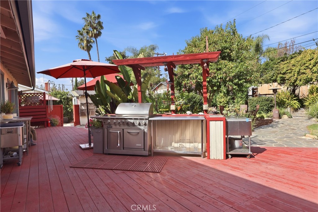 CLAREMONT SINGLE STORY WITH AMAZING BACKYARD – this desirable ranch style home offers 4 bedrooms with 3 bathrooms and approximately 1806 Sq Ft on 10k Sq ft lot. As you drive up you will find drought tolerant front landscaping with front deck and oversized driveway. Enter to find a family style floorpan with bedrooms on one end and living area on the other. The 4 bedrooms include a primary suite with private remodeled bathroom that includes a walk-in tile shower with dual heads, hand-crafted vanity and sliding wood doors. There is one bedroom with adjoining bathroom great for guests or in-law suite. The kitchen was created for the chef in the family and offers stainless wall paneling with open shelving cabinets, commercial oven/range/hood, wood island and bar seating. There is a walk-in pantry and laundry area next to kitchen. The kitchen opens to a large living/dining room with built-in entertainment center and shelving, brick fireplace and plenty of storage. The living room offers French doors that brings the indoors out to a serene backyard with large wood deck, built in BBQ island, flagstone walkway, grass area and an abundance of mature landscaping and fruit trees. There is also an above ground private spa, workshop, and insulated studio with electricity. Plenty of room to add your ADU. Other upgrades include Tankless Water Heater, Solar System with battery, newer roof, and newer HVAC with ducting. Located within walking distance to elementary school and park. Call today!