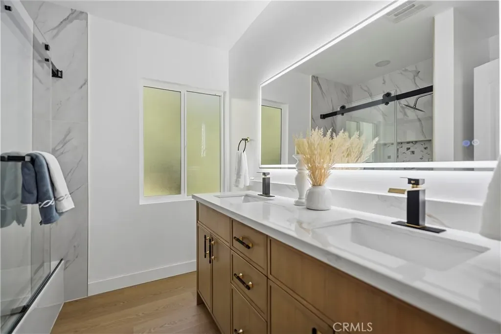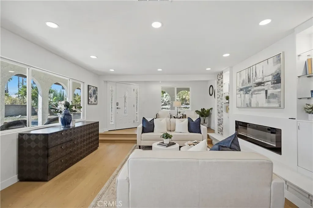 Arrive at home through the automatic entrance door, offering convenience and enhanced security, and notice the freshly painted driveway that adds instant curb appeal. Step inside to a stunning open-floor design, featuring stylish renovations throughout: beautiful flooring, an oversized kitchen island, quartz countertops, stainless steel appliances in both kitchen and bathrooms, and modern fireplaces in the living spaces, and new doors, windows, central AC, and water heater, blending timeless design with modern convenience.