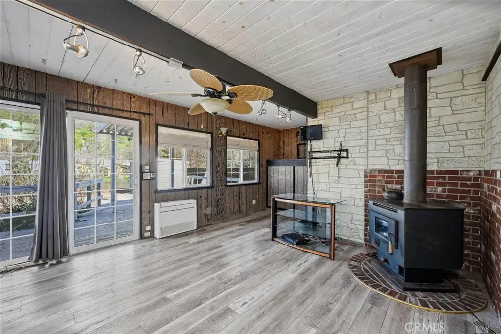The primary bedroom opens to a private covered patio deck, a perfect place to relax with your morning coffee or unwind after a day on the water. A sunroom enclosed patio brings in natural light and creates additional living space, while the bonus media room with its own wood stove offers a cozy retreat for movie nights, hobbies, or guests.