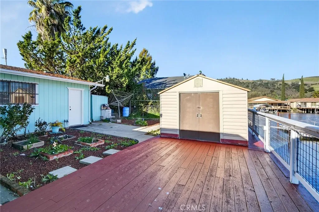 At the end of a peaceful cul-de-sac, this inviting 2-bedroom, 2-bathroom Clearlake Keys home offers both comfort and functionality. The interiors boast brand-new flooring throughout and fresh paint. Inside, you’ll find a generous living room that seamlessly connects to a dining area. The efficient galley kitchen is designed with plenty of counter space for preparing favorite meals. Step outside onto the recently updated deck, perfect for entertaining guests or relaxing with morning coffee as you take in channel views and abundant lake wildlife. The covered deck overlooks the tranquil channel, offering a peaceful retreat and easy access via gangplank to your private dock and boat slip. Access to Clear Lake via the channel. Amenities abound, including convenient RV or boat parking and a spacious two-car garage with driveway. The garage features washer-dryer hookups, laundry sink, workbench, and cabinets. Outdoor spaces feature a fenced backyard equipped with an irrigation system. Two storage sheds provide extra room for tools, gardening equipment, or seasonal items. Whether you’re looking for a getaway or an everyday home, this property promises versatility and an ideal lakeside lifestyle.