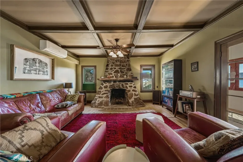 The 1,341-square-foot home features two bedrooms and one bathroom, complemented by a warm wood-burning fireplace that anchors the living space with character and comfort. A wraparound sunroom floods the interior with natural light while framing stunning lake views that transform every season into a visual masterpiece.