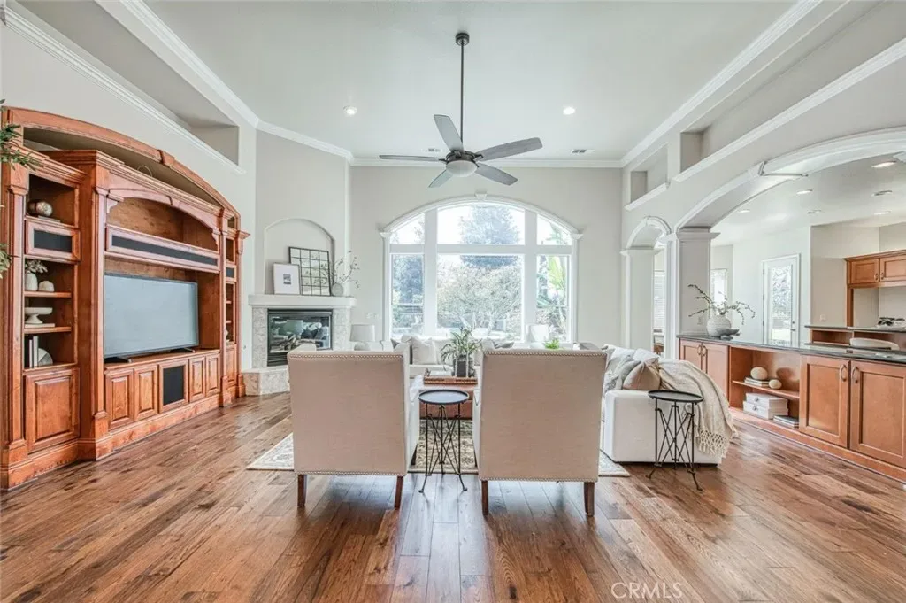A stunning double-door entry welcomes you into a thoughtfully designed interior highlighted by arched doorways, custom trim casings and built-ins in the family room.