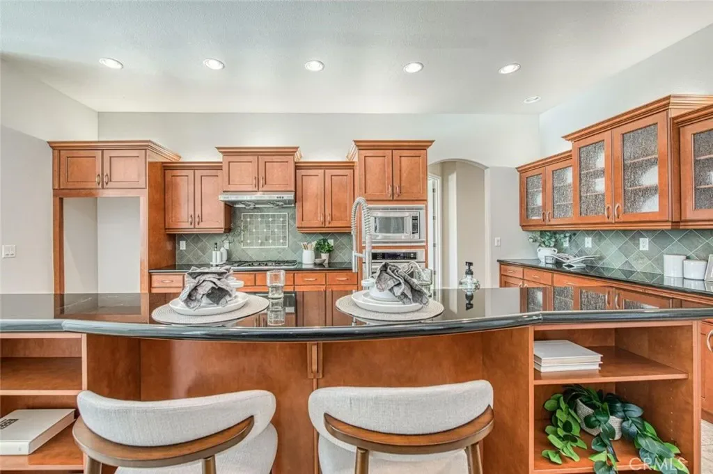 The chef’s kitchen offers extensive storage, custom cabinetry, granite countertops, stainless steel appliances, a five-burner gas stove, breakfast bar, large pantry, and an oversized dining nook with direct backyard access.
