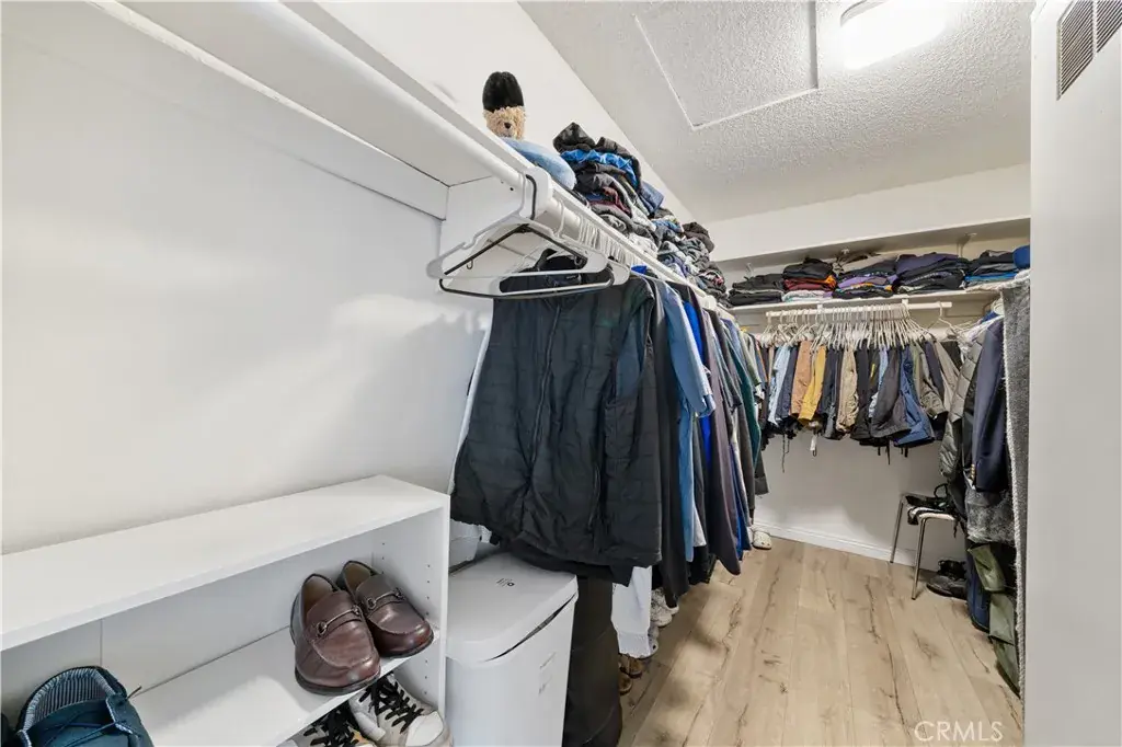 Down the hallway, you’ll find a full bathroom and an indoor laundry closet designed for a stackable washer and dryer. The spacious primary bedroom features a large walk-in closet, providing ample storage and functionality.