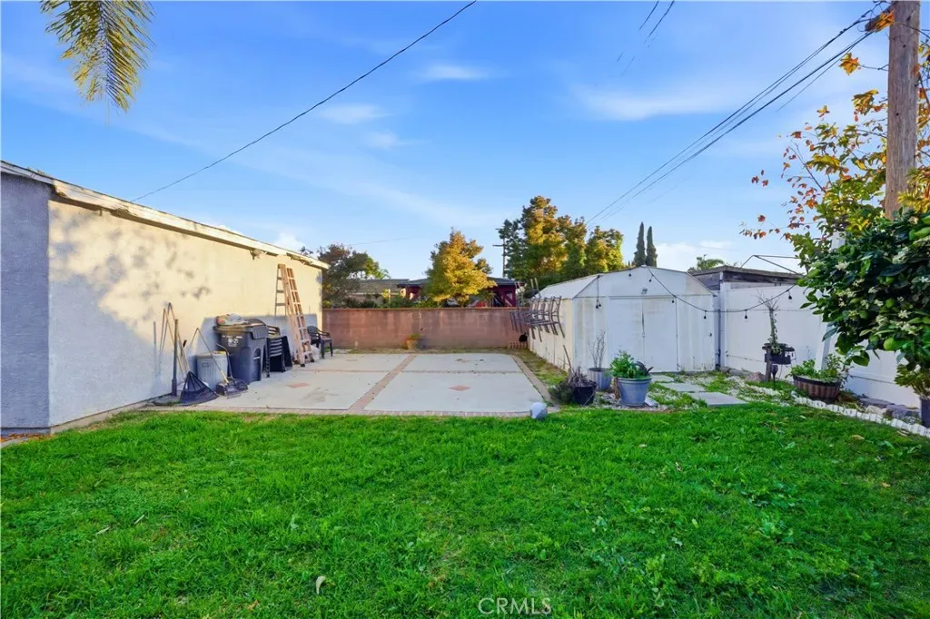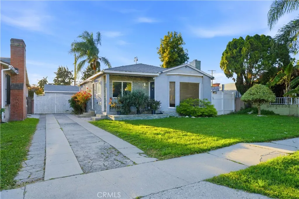 This 4-bedroom, 2-bath home offers approximately 1,390 sq ft of living space on a 7,002 sq ft lot. A covered front porch leads into the open living and dining area featuring a fireplace and large windows providing natural light. The kitchen includes granite countertops, white cabinetry, tile backsplash, and a center island for food prep and storage. The primary bedroom features recessed lighting, a walk-in closet, and an en-suite full bathroom with soaking tub, and separate glass-enclosed shower. A ¾ hall bathroom serves the additional bedrooms. Interior spaces include updated flooring and ceiling fans in multiple rooms. The backyard includes a grass area, patio space for outdoor seating or dining, an above-ground spa, and a grapefruit tree. The long driveway provides access to a detached 2-car garage with additional off-street parking. Located near neighborhood parks, shopping centers, dining options, and major transportation routes.