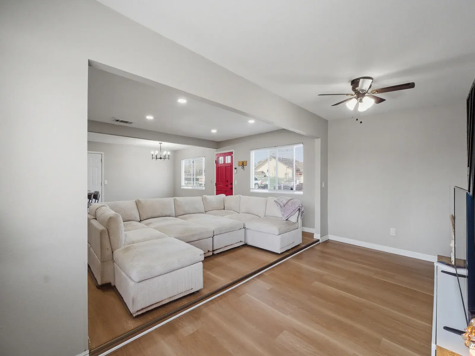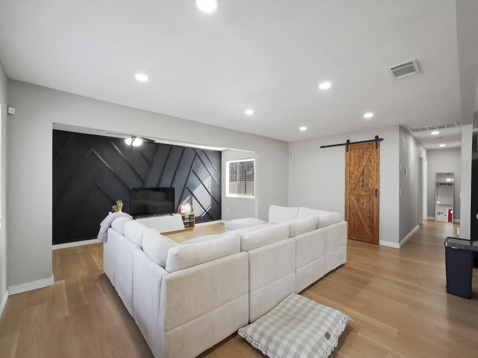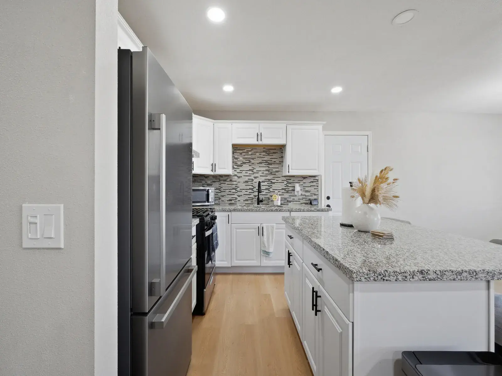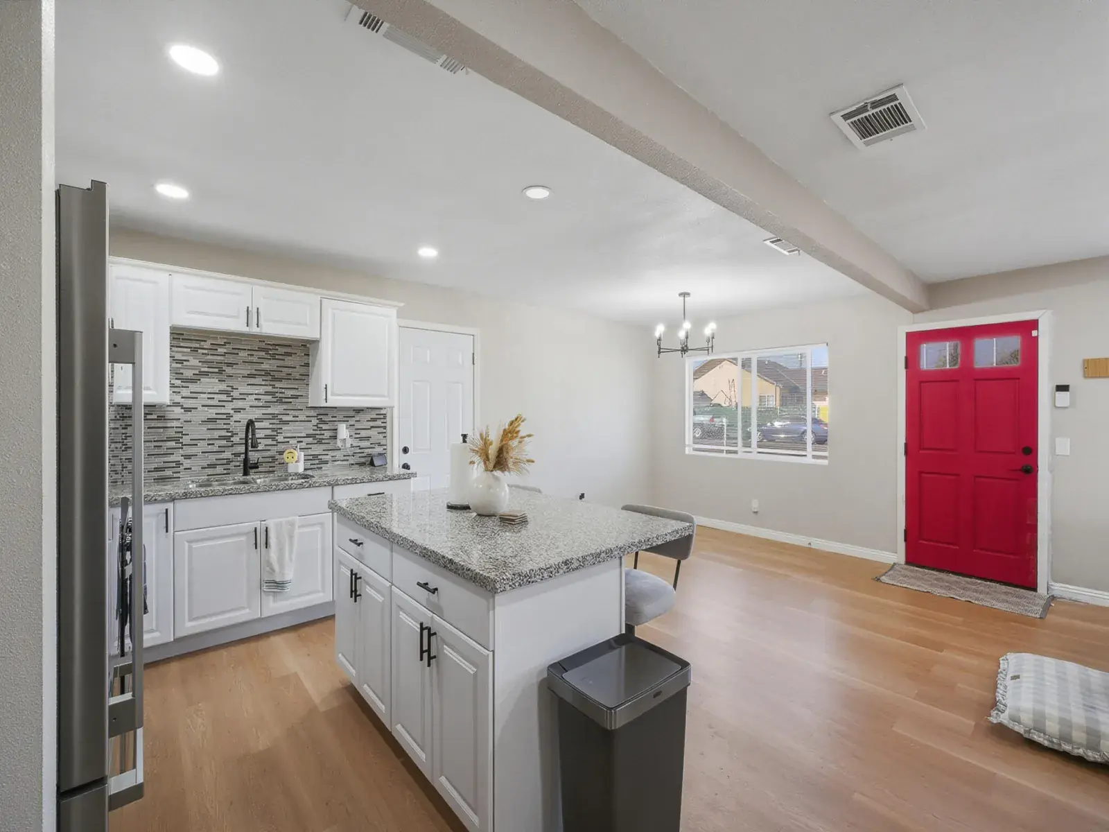 Welcome to this beautifully updated, move in ready home on Stanley Avenue in the heart of Corcoran, offering a modern open concept layout with thoughtful upgrades throughout. The main living area features recessed lighting, warm wood style flooring, and a striking custom accent wall that creates a cozy yet contemporary focal point, flowing seamlessly into the dining area and remodeled kitchen ideal for both everyday living and entertaining. The kitchen is highlighted by crisp white cabinetry, granite countertops, a stylish mosaic tile backsplash, stainless steel appliances, a large center island with bar seating, and sleek black fixtures, while a charming barn door adds both character and functionality. Bedrooms are bright and comfortable with updated flooring, neutral tones, ceiling fans, and generous closet space, including a spacious primary bedroom with convenient access to a tastefully updated bathroom featuring a modern vanity, black hardware, and a tiled tub/shower surround with built in niche. Outside, the property offers a large driveway leading to an attached garage, a fully fenced yard for added privacy, and a spacious backyard with a concrete patio area providing a versatile canvas for outdoor entertaining, gardening, play space, or future customization. Corcoran continues to gain momentum as an affordable Central Valley community, supported by ongoing city improvements, a strong agricultural economy, and growing buyer interest from those seeking value, space, and small town charm with convenient access to surrounding employment hubs. This thoughtfully refreshed home delivers comfort, style, and long term potential in a community that continues to move forward.