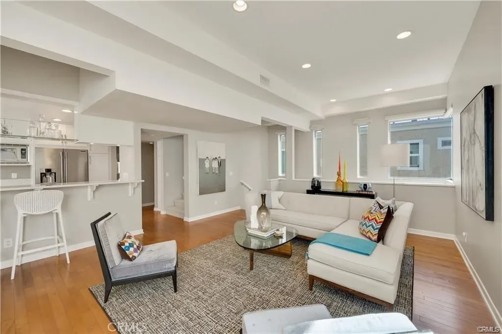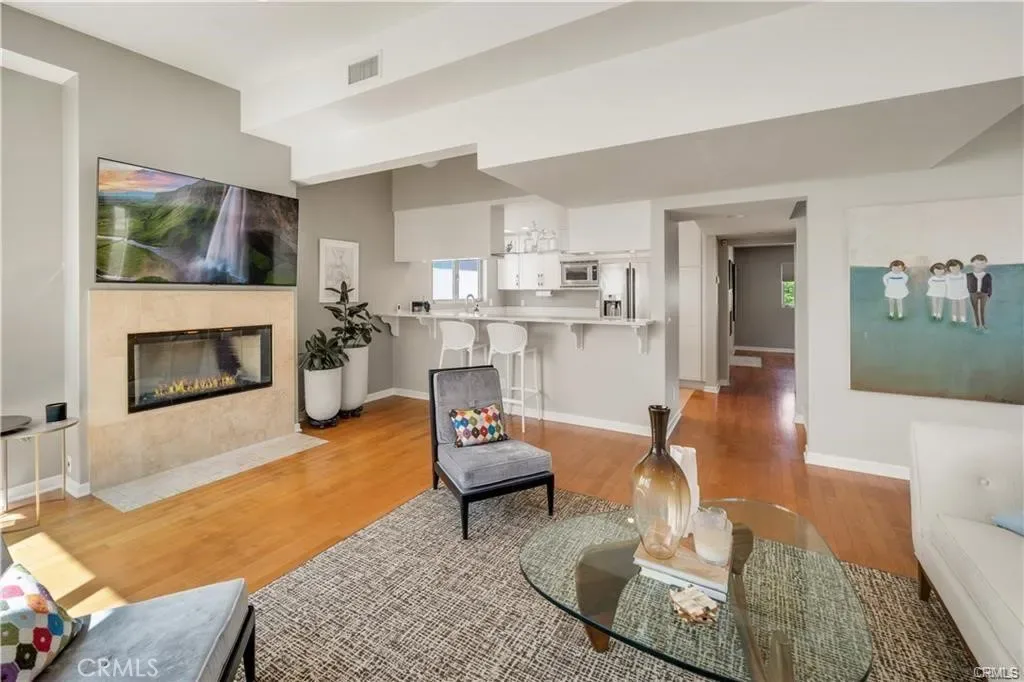 Stunning rear unattached condo on Poinsettia- a beautiful Corona Del Mar tree lined street. Built in 2005, this Strickler designed home is exceptionally light and bright, with no large homes on either side. With numerous windows, the ocean breeze and sun pour through this freestanding back unit. Enjoy the contemporary architectural details throughout as well as hardwood and travertine floors throughout the main floor. The completely upgraded kitchen includes stainless appliances, and flows perfectly into the living room with high ceilings as well as a cozy fireplace. Cook and entertain simultaneously! Large master suite is connected to the luxurious master bath by a duel fireplace. Enjoy the impressive separate soaking tup and shower. Spacious second bedroom, and full bath is upstairs with glass tile countertops. Direct access to the rooftop deck with peek-a-boo ocean views by day and twinkling lights by night. Enjoy this amazing Corona Del Mar condo and all the Village has to offer!