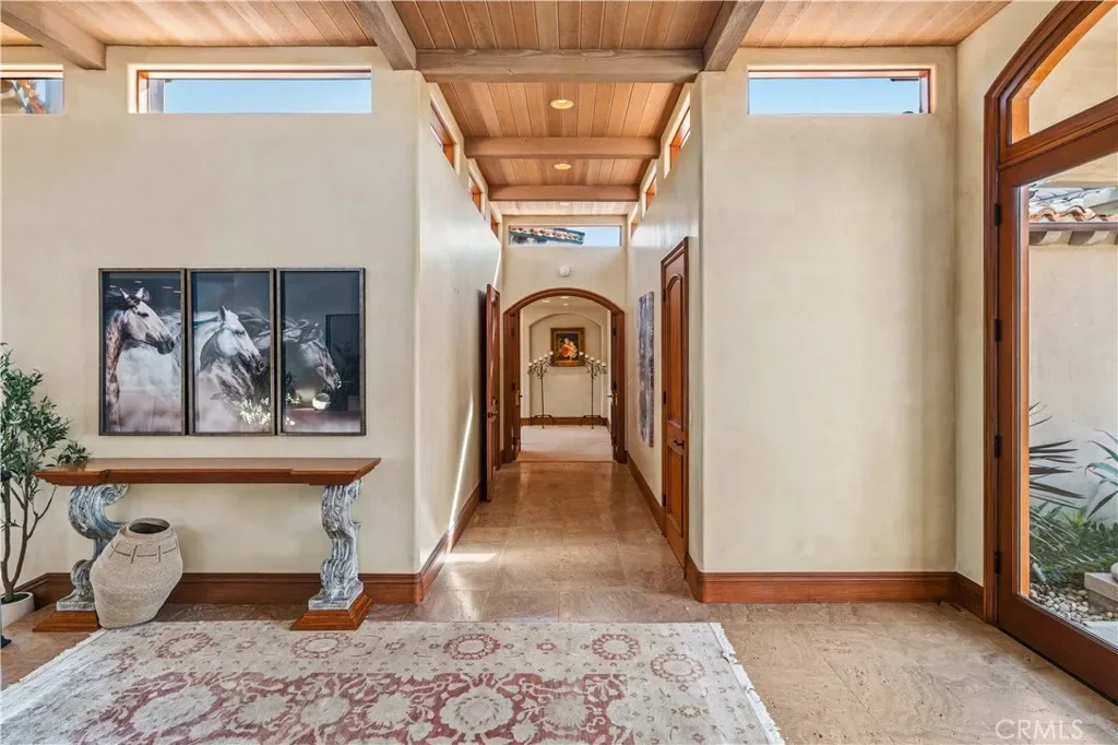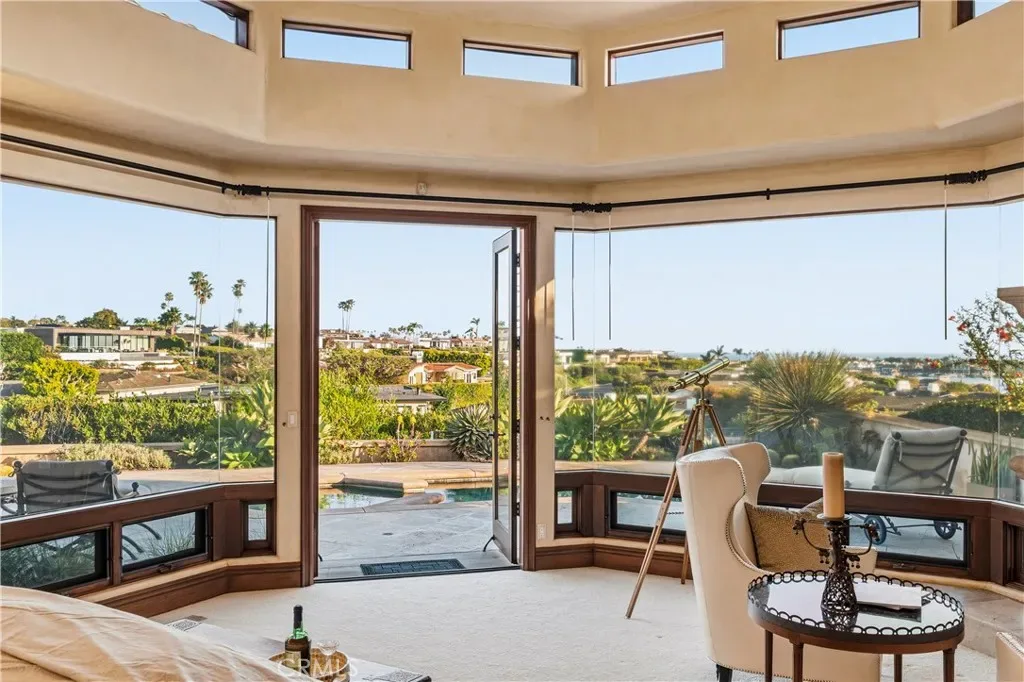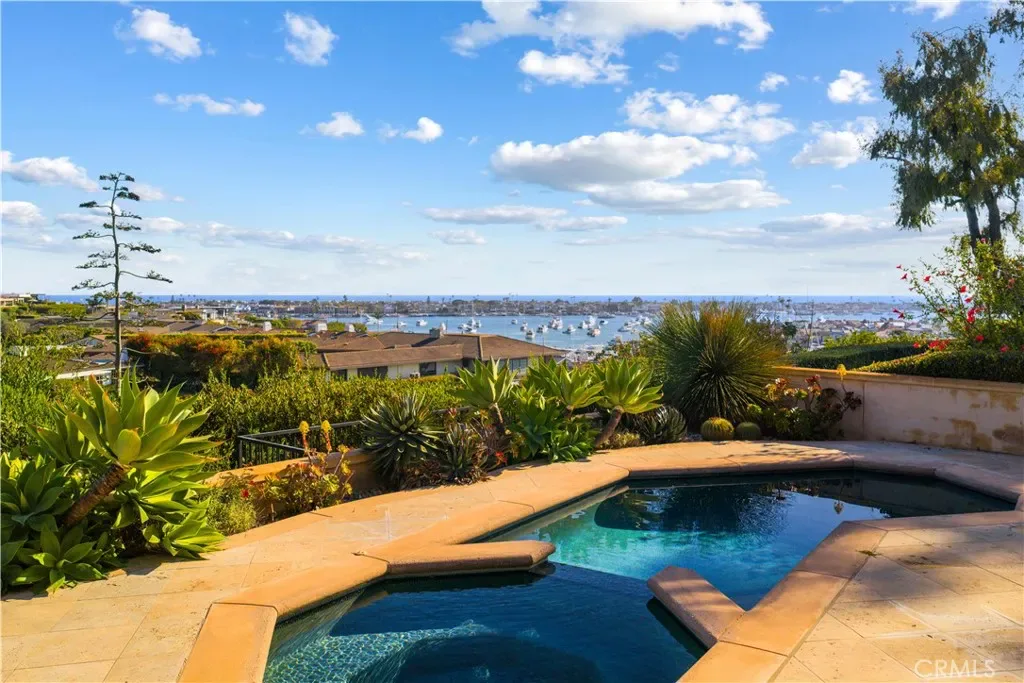 Perched in the highly coveted Irvine Terrace neighborhood of Corona del Mar, this Mediterranean-inspired single-level residence captures breathtaking, front-row views of the Pacific Ocean, Catalina Island, and Newport Harbor. Ideally situated moments from Fashion Island and the vibrant charm of Corona del Mar Village, the home offers an exceptional blend of privacy, convenience, and coastal living. Designed for effortless indoor-outdoor living, the open-concept floor plan features expansive retractable walls of glass that seamlessly connect the interior to a resort-style backyard complete with pool, spa, and generous entertaining spaces. Interior highlights include travertine flooring, rich wood-beamed ceilings, and a spacious living room with fireplace and custom built-in bookcases. The chef’s kitchen enjoys panoramic ocean and harbor views and opens to both the living and dining areas. It is appointed with custom cabinetry, professional-grade stainless steel appliances, and a Sub-Zero refrigerator and freezer. The primary suite is a private retreat, offering equally stunning unobstructed views of the ocean, Catalina Island, and harbor, along with a cozy fireplace and built-in cabinetry. The luxurious primary bath features dual vanities, a walk-in shower, and a separate water closet. A detached casita-style guest suite provides ultimate flexibility with its own fireplace and en-suite bath, while an additional bedroom—ideal as an office or guest room—includes a private bath. Additional amenities include a two-car attached garage. A rare opportunity to own a single-level view home in one of Corona del Mar’s most desirable enclaves.