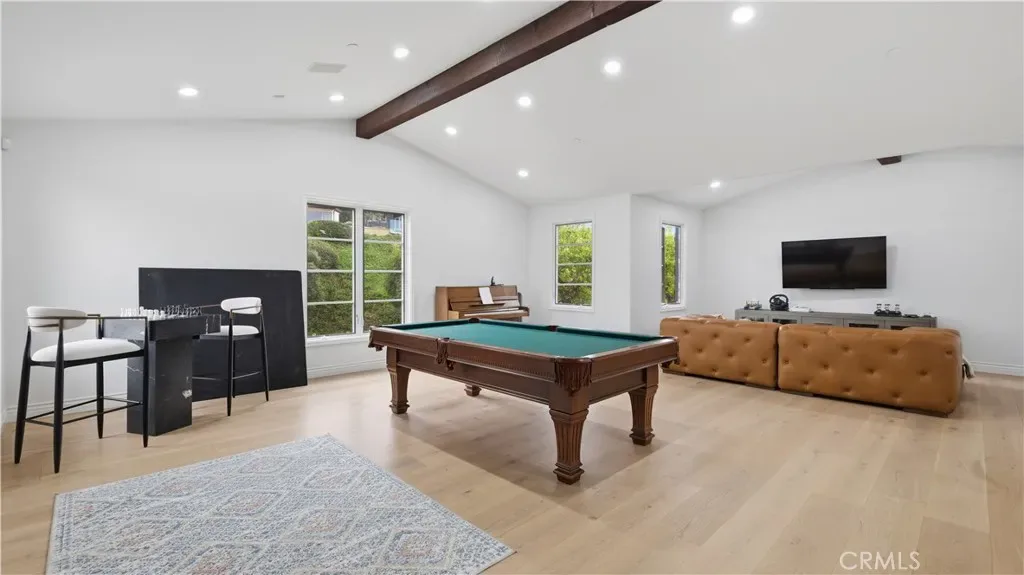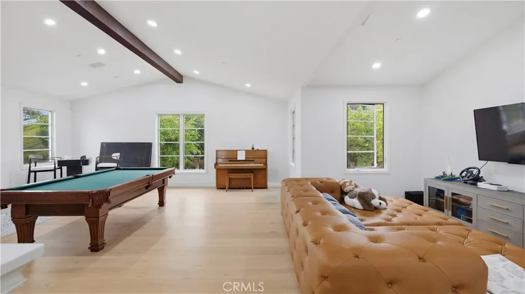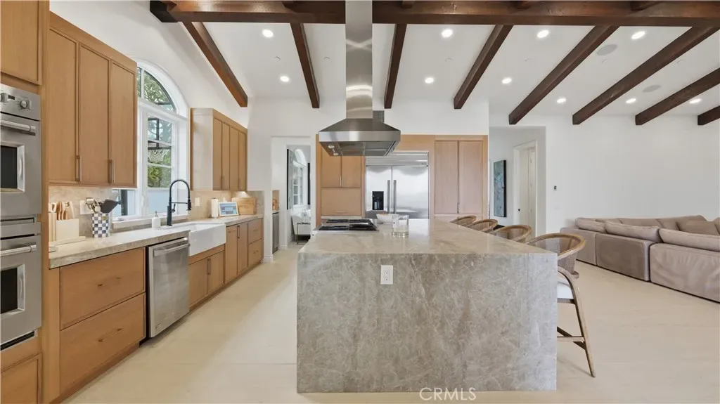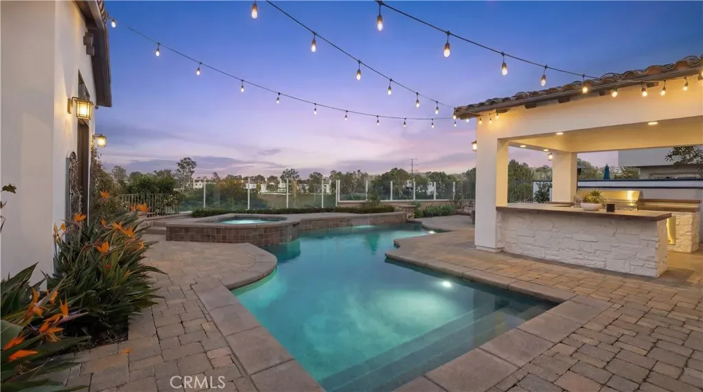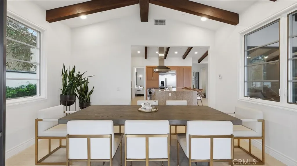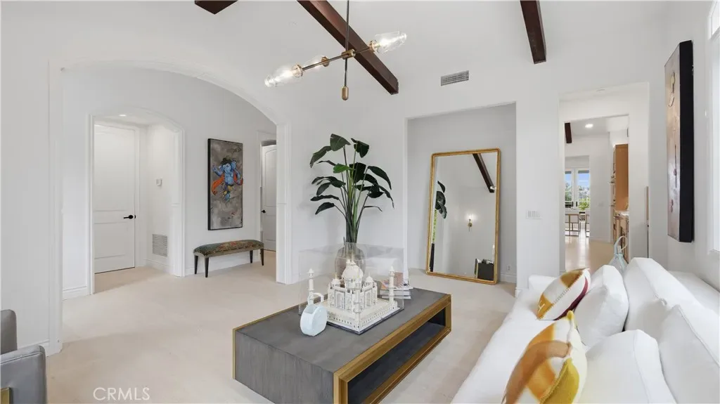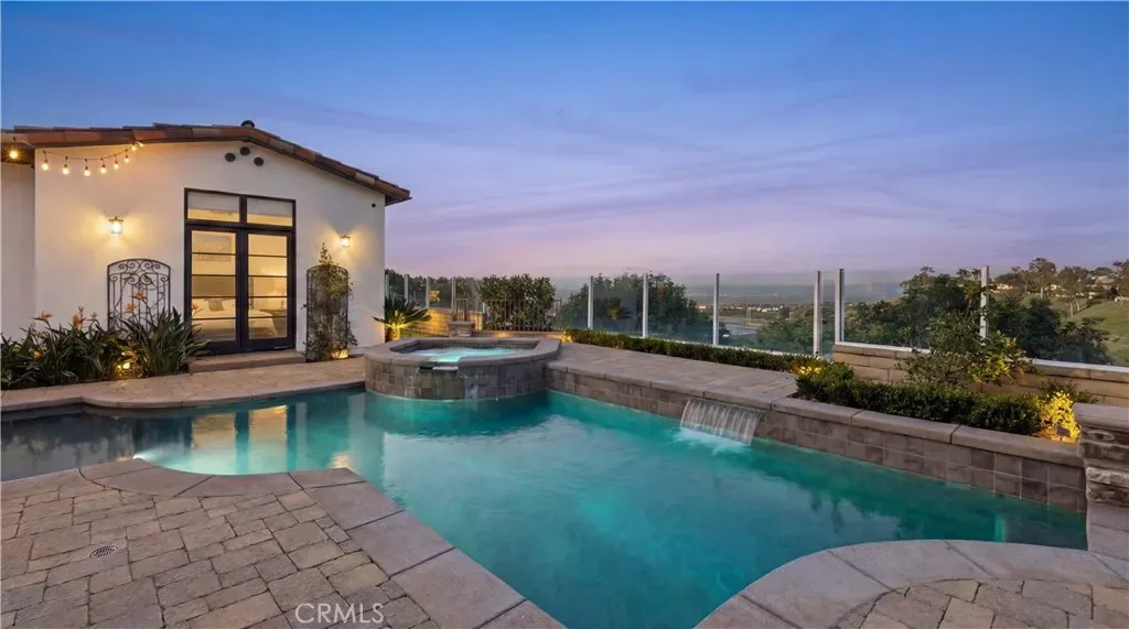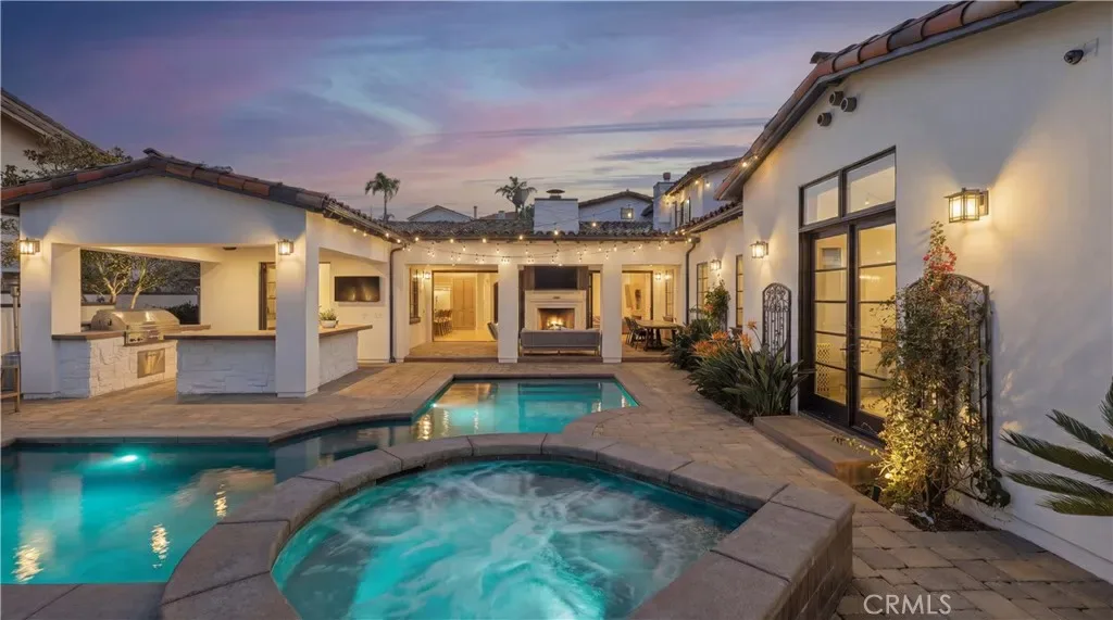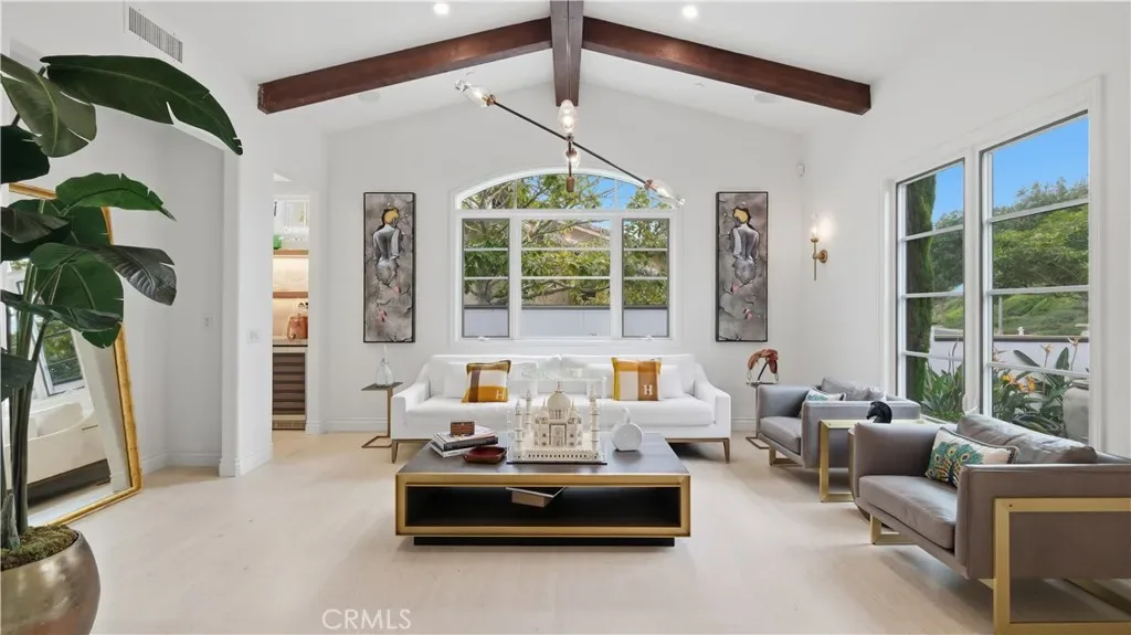 Positioned to capture panoramic mountain and city light views, this fully renovated home offers the convenience of single level living complemented by an additional upstairs bonus room and en suite bedroom and gym. Set on an expansive lot, the property features a gated entry courtyard and a resort style backyard with a pool, spa, and spacious patio, ideal for both everyday living and entertaining. The main level includes four well appointed bedrooms including the primary suite, New limestone and hardwood flooring, fresh paint interior and exterior, plumbing, and new lighting has been added throughout the home, enhancing its fresh, transitional appeal while the vaulted ceilings with exposed beams and hardwood floors adds character and warmth. The gourmet kitchen is equipped with Taj Mahal quartzite countertops, custom cabinetry, and high end stainless steel appliances, including dual ovens and a built-in refrigerator. The open concept layout flows into the family room, where a fireplace and large center island create an inviting gathering space. Designed for seamless indoor outdoor living with two sets of bi folding door systems, multiple rooms open directly to the backyard, where a covered loggia with a full outdoor kitchen extends the living space. Glass railings preserve unobstructed views, while custom lighting enhances the outdoor ambiance. The primary suite features a walk in closet, dual vanities, and a walk in shower. Generously sized secondary bedrooms and recently updated bathrooms. Located on a quiet, single loaded street, this home offers privacy while remaining close to hiking trails, parks, and top coastal destinations, including Fashion Island, Crystal Cove State Park, and Corona del Mar.