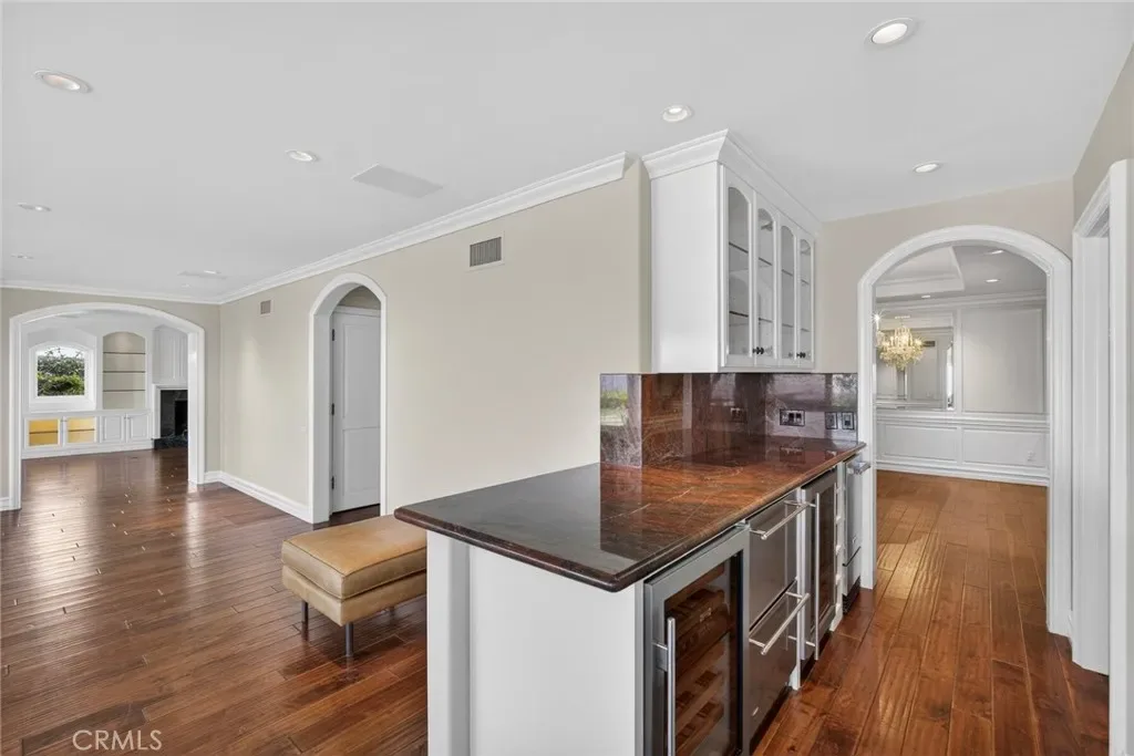 At the heart of the home lies a gourmet kitchen designed to inspire your culinary adventures. Outfitted with Rosso Levanto marble countertops, a full-size Subzero refrigerator and freezer, and premium Thermador appliances—including a six-burner stove with griddle, double ovens, and a microwave with heating drawer—this space invites culinary creativity. The kitchen seamlessly opens to a wet bar featuring a Subzero wine fridge and GE drink drawers, providing the perfect setting for entertaining. Casual dining is easily accommodated at the barstool seating or the welcoming dining table, connecting you to the spacious family room.