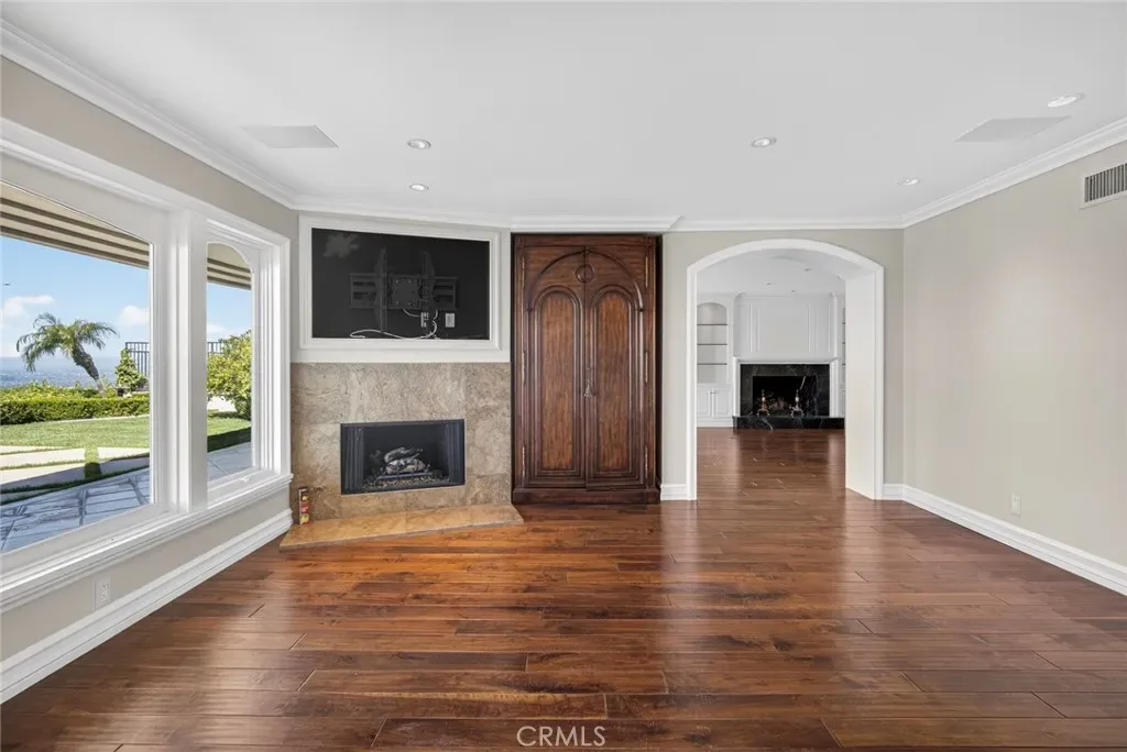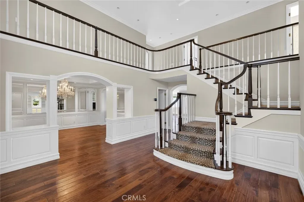 Step inside through the impressive entrance that establishes an atmosphere of luxury. To your left, you’ll find an elegant formal dining room adorned with exquisite wood paneling; to your right, a refined formal living room with a marble fireplace, custom cabinetry, and stunning walnut hardwood floors that flow throughout the residence.