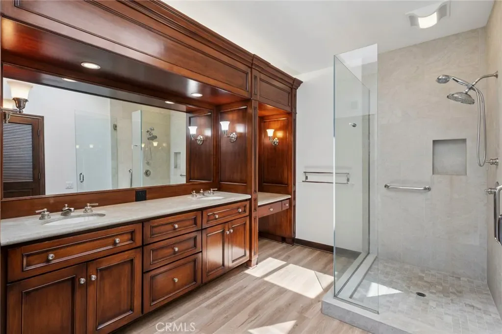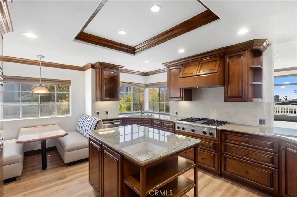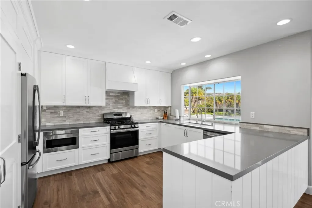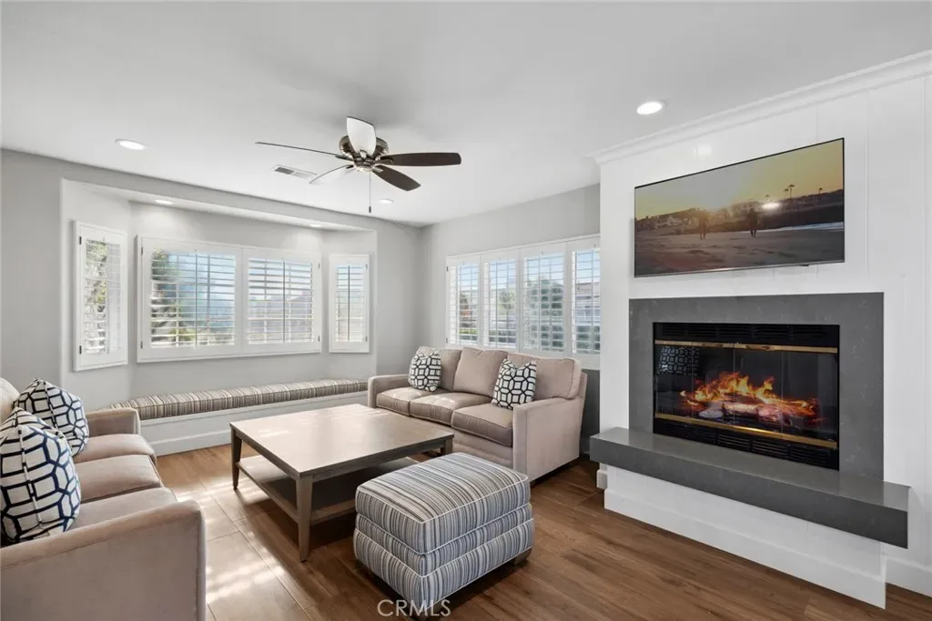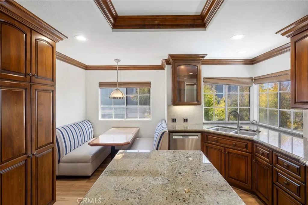One of the most exquisitely reimagined residences to grace the coveted “55 and better” Terraces, all single level, with no steps in the home, and ideally situated in the heart of Corona del Mar. This sophisticated two-bedroom, two-bath home with a dedicated office has been thoughtfully curated with elevated finishes throughout—every detail meticulously completed for effortless living. The gourmet kitchen is a statement of timeless elegance, featuring custom cabinetry, granite countertops, a charming built-in breakfast nook, integrated refrigerator, and a bespoke range hood. A beautifully opened pass-through seamlessly connects the kitchen to the living space, enhancing both flow and natural light while creating an inviting, open-concept ambiance. Underfoot, luxury linoleum flooring extends throughout, complemented by refined baseboards and crown molding. Both bathrooms have been impeccably redesigned with elevated custom vanities, stone surfaces, and sleek frameless walk-in showers, evoking a spa-like experience. Our Primary enjoys a full walk-in closet. The secondary suite has been thoughtfully enhanced with the addition of a private door, creating a true ensuite retreat and offering exceptional privacy for guests. This room also features a built-in Murphy bed for room use flexibility. Additional highlights include an attached laundry area with newer LG washer and dryer, as well as an epoxied garage floor—just a few of the many upgrades that define this elegant home. Enjoy enchanting views in the distance of the ocean and Catalina Island, along with shimmering city lights and breathtaking sunsets. The Terraces boasts a sparkling ocean-view pool and spa, along with charming Clubhouse and other amenities. Ideally located adjacent to the Oasis Senior Center and just moments from all that Corona del Mar has to offer—beautiful beaches, world-class dining, chic boutiques, and upscale markets—this residence embodies refined coastal living at its finest.