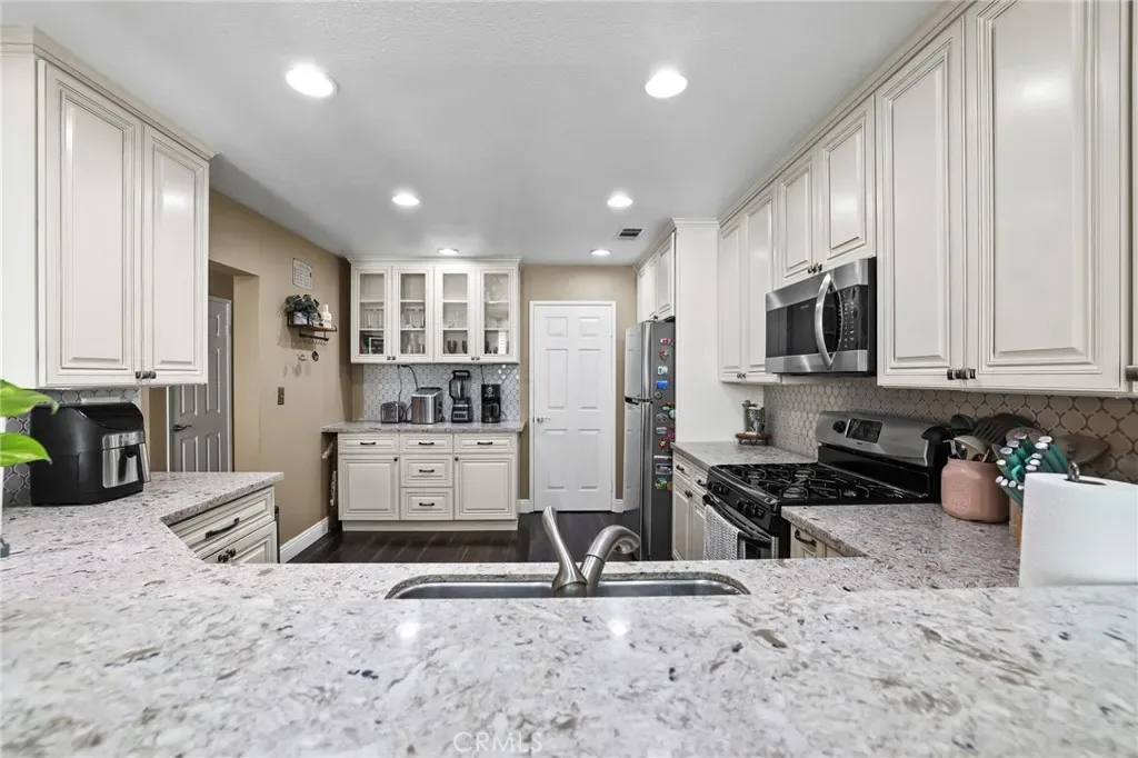 Welcome to this beautifully upgraded home in the highly desirable Laing’s First Edition community in Corona Hills. This spacious residence offers 3 bedrooms, 2.5 bathrooms, and an open-concept layout designed for modern living. Natural light pours into the living area through a skylight, creating a warm and inviting ambiance. The updated kitchen is a showstopper, featuring quartz countertops, custom cabinetry, a designer mosaic backsplash, and stainless steel appliances. A cozy breakfast bar flows seamlessly into the dining and living spaces, where you’ll find a charming fireplace, luxury vinyl plank flooring, crown molding, and ceiling fans that add comfort and style throughout. Enjoy indoor-outdoor living with shuttered sliding doors that open to a private front patio, plus a balcony off one of the bedrooms. The luxurious primary suite is your personal retreat, complete with a large walk-in closet and private en-suite bath. This sought-after community offers residents access to a sparkling pool and lush gardens, while a 2-car attached garage provides convenience and storage. Perfectly located, you’re just a short stroll to shopping, dining, movie theaters, parks, and hiking trails—with easy access to the 91 and 15 freeways. Low HOA and low taxes make this home an even greater value! ***This home qualifies for a $10K forgivable loan!***