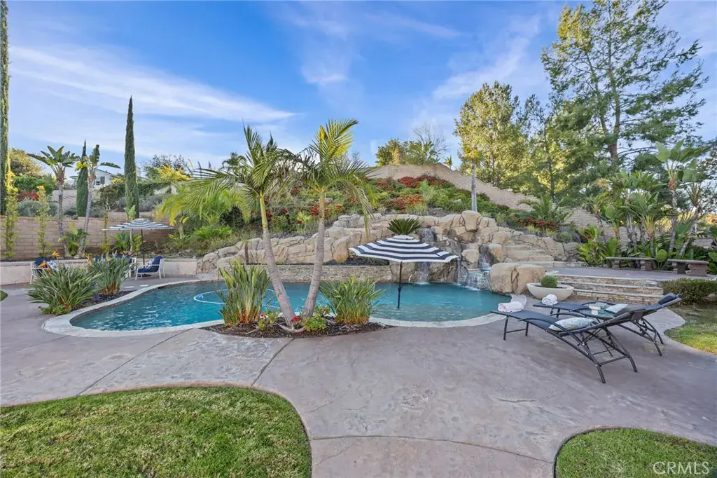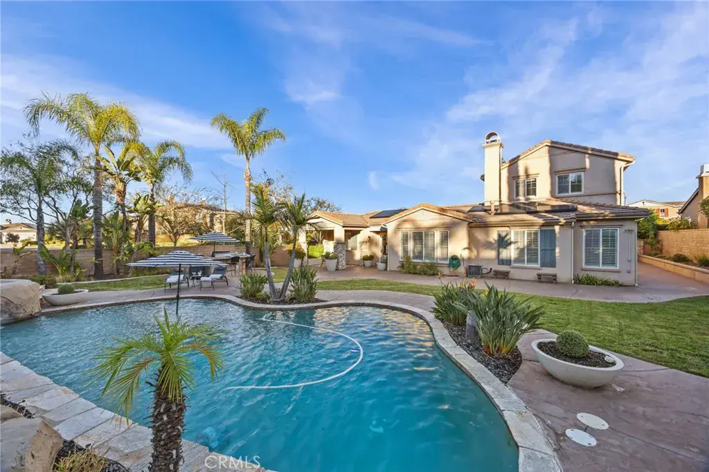 Welcome to this stunning 4-bedroom, 3.5-bath corner lot pool home in the private, guard-gated community of The Retreat. Step inside to discover a light-filled center courtyard surrounded by windows, featuring large planters, a fountain, a fireplace, and even a built-in dog door. Main Level: The main floor offers thoughtfully designed living spaces including two bedrooms with walk-in closets and custom built-ins, connected by a Jack and Jill bathroom. The expansive primary suite is a true retreat, complete with a fireplace, en-suite bathroom with jacuzzi soaking tub, dual vanities, an oversized walk-in shower with bench, and a generous walk-in closet with custom shelving. Entertaining is effortless with a formal living room and dining room, plus a spacious family room featuring built-ins and a cozy fireplace. The gourmet kitchen is a chef’s dream with double ovens, a dishwasher, gas range, large center island, and two separate pantries. Upper Level: Upstairs, you’ll find flexible living space including a large bonus room, a loft with built-in desk, and a guest bedroom with mirrored closet doors and full bathroom—perfect for visitors or extended family. Outdoor Paradise: The backyard is truly spectacular! Enjoy the sparkling pool and spa alongside a built-in BBQ with ample seating and mini refrigerator. Ascend the dual staircases flanking the pool to reach the gas fire pit, where you can take in breathtaking views of your private oasis below. Additional Features: 3-car tandem garage with storage racks and cabinets, large concrete planters throughout (included!) and leased solar panels. Prime location near the 15 freeway, Dos Lagos shopping center, and the Crossings. This exceptional home offers far more than words can capture—schedule your private showing today!