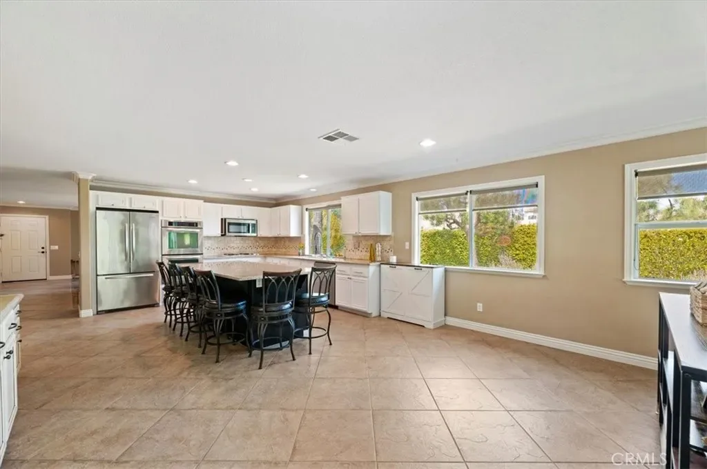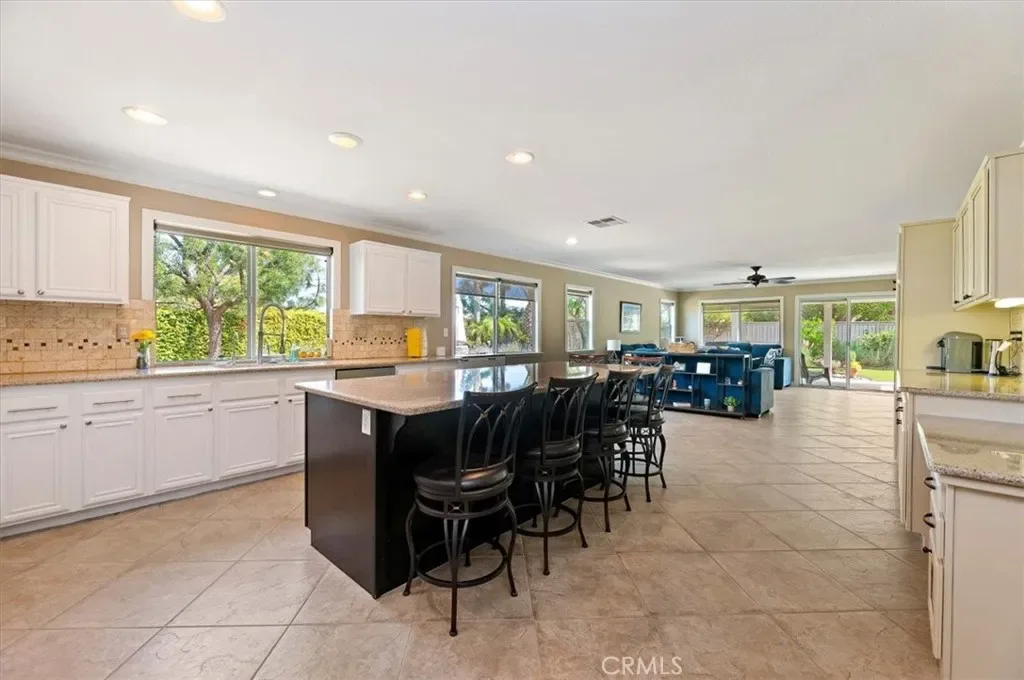 The upgraded kitchen is a chef’s dream, complete with granite countertops, travertine backsplash, a large island, double ovens, stainless steel appliances, and a generous walk-in pantry—all opening to the expansive family room with a cozy fireplace and seamless access to the backyard.