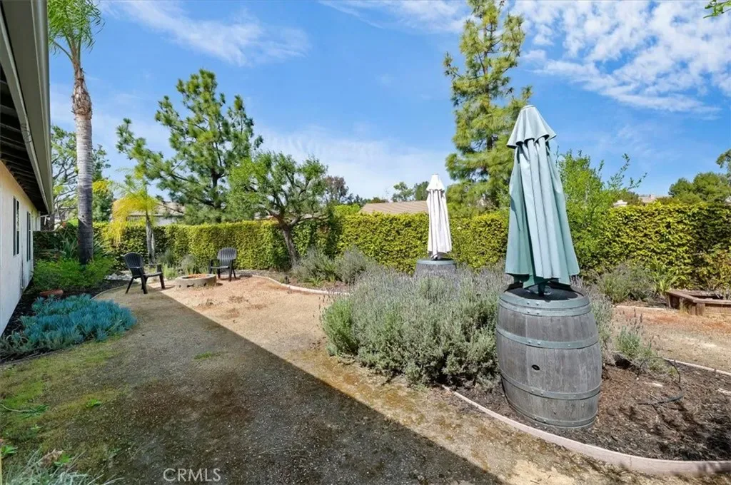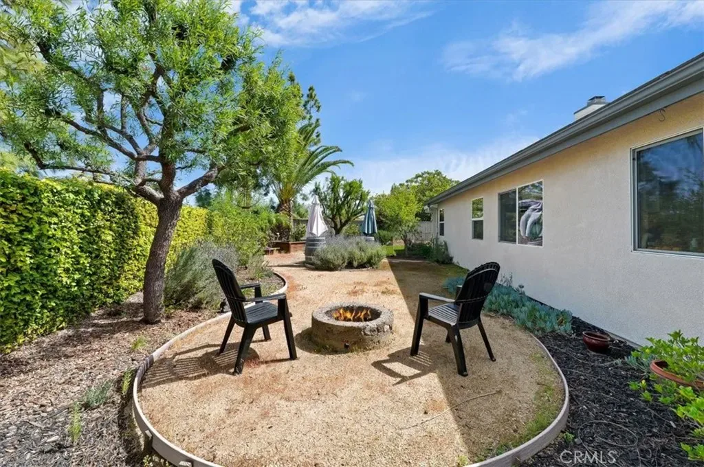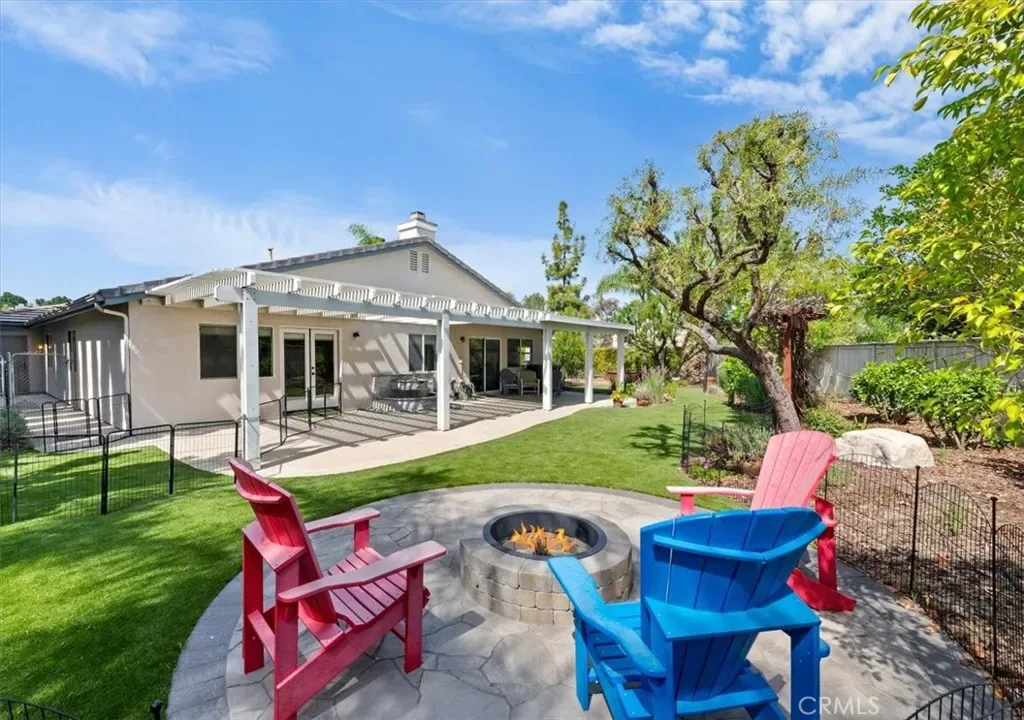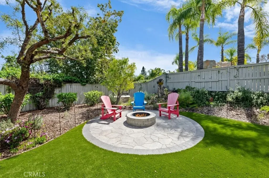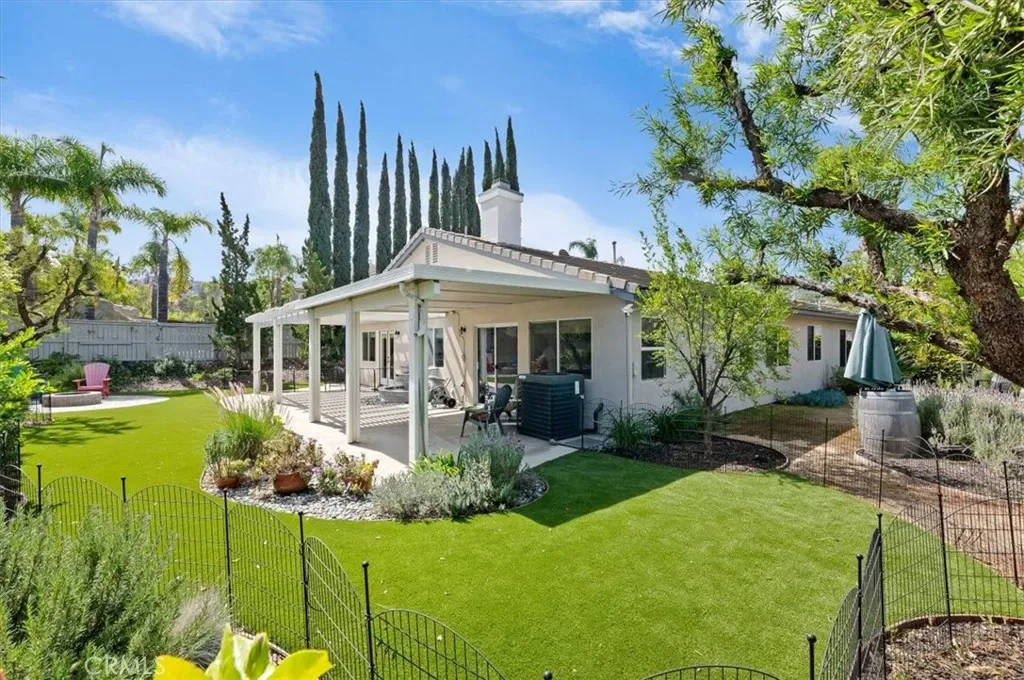 Step outside to the private backyard oasis showcasing artificial turf, water-wise landscaping, two firepits, mature Pepperwood and Italian Pine trees, lavender, a tranquil fountain, and an Alumawood patio cover—perfect for entertaining.