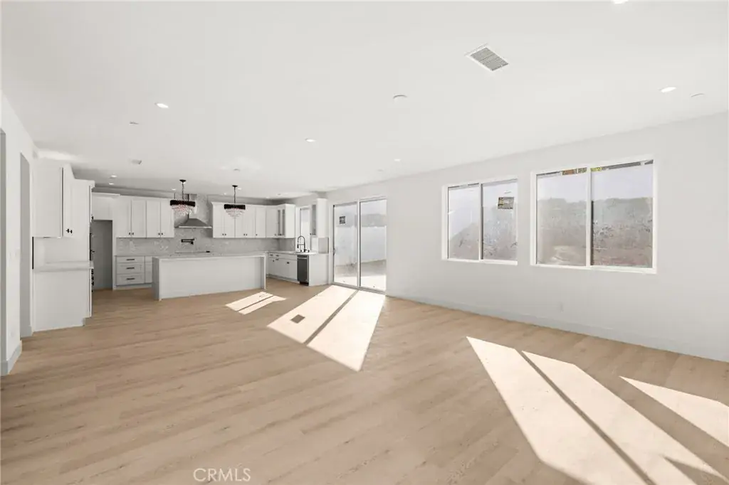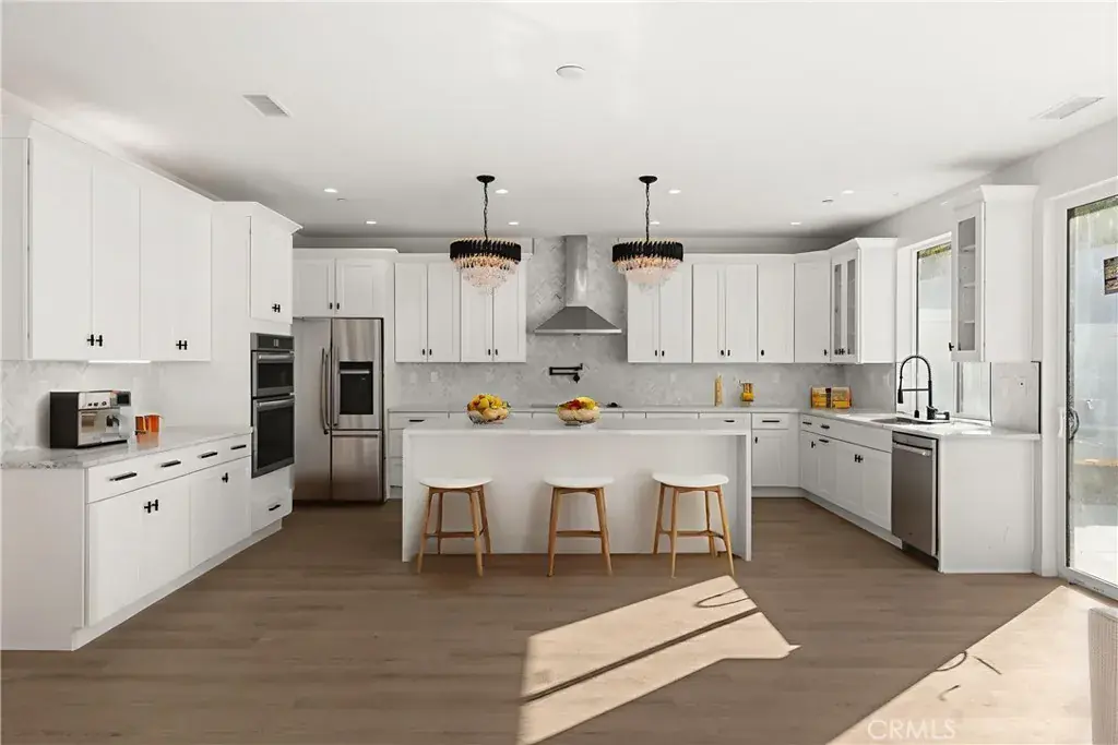 Step inside to a bright and open floor plan featuring high ceilings, clean modern finishes, and luxury vinyl plank flooring throughout. The gourmet kitchen is the centerpiece of the home, showcasing sleek white cabinetry, quartz countertops, stainless steel appliances, and a large center island perfect for entertaining or family gatherings. The kitchen opens seamlessly to the dining and living areas, creating a true open-concept layout filled with natural light.