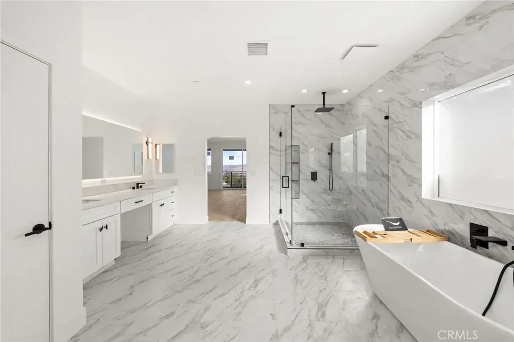 Downstairs includes a private bedroom with a full bath, ideal for guests or multi-generational living, along with a convenient half bath for visitors. Upstairs, the spacious primary suite offers a spa-inspired bathroom with dual sinks, a large soaking tub, and a walk-in shower. Four additional bedrooms provide plenty of space for family, home office, or flex needs.