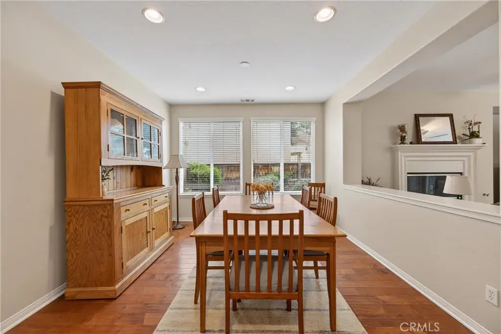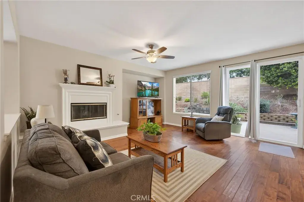Drought tolerant landscaping enhances the home’s curb appeal in both the front and backyard. Inside, the main level showcases hardwood floors, a formal living room, and a dedicated dining room. The open concept kitchen flows seamlessly into the family room, creating an ideal space for everyday living and entertaining. The kitchen offers granite countertops, a large center island, abundant cabinetry, and generous storage. The spacious family room centers around an impressive fireplace, offering a warm and inviting place to unwind.