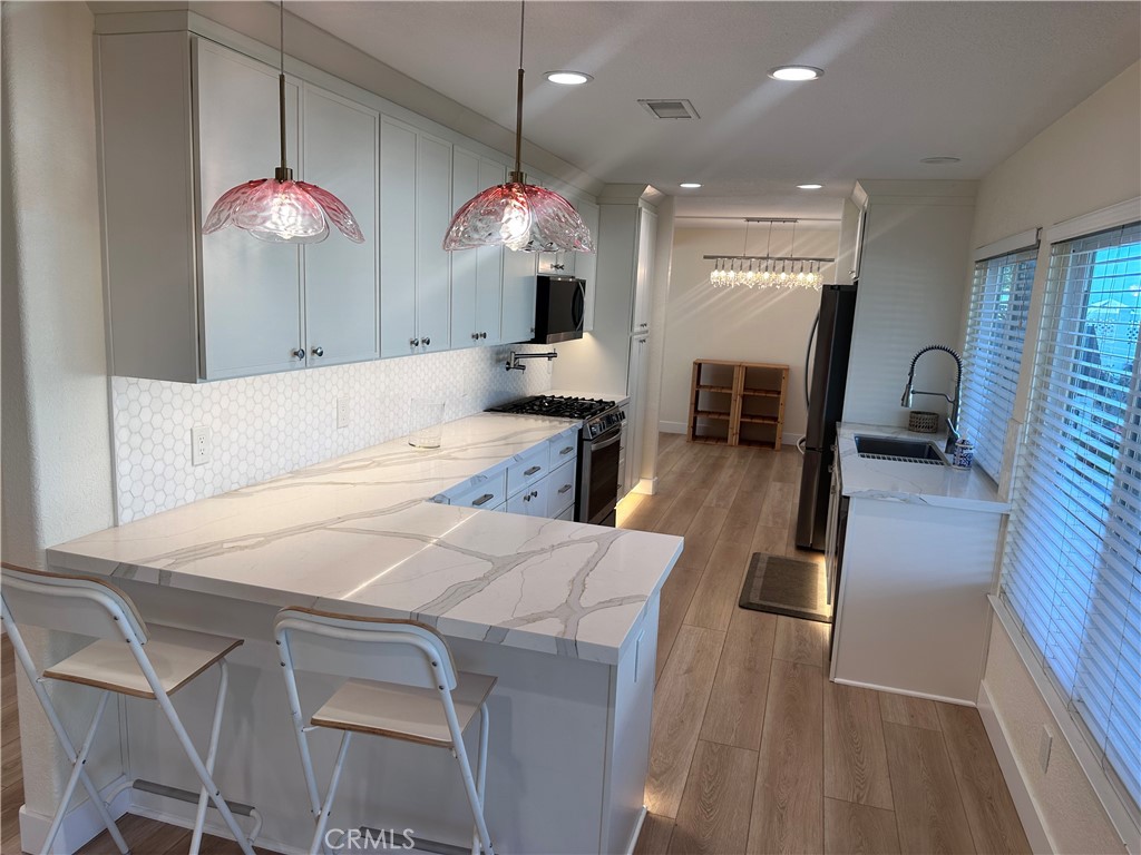 Remodeled kitchen with quartz countertops, stainless appliances, oversized custom cabinets, and center peninsula and LED undercabinet lighting and Toe kick lighting for a perfect dinner ambiance. New granite countertops in the bathrooms. Beautiful maintained landscaping with lots of palm trees, fruit trees avocado, cherry ,orange ,fig ,very mature varieties of roses surrounding the house