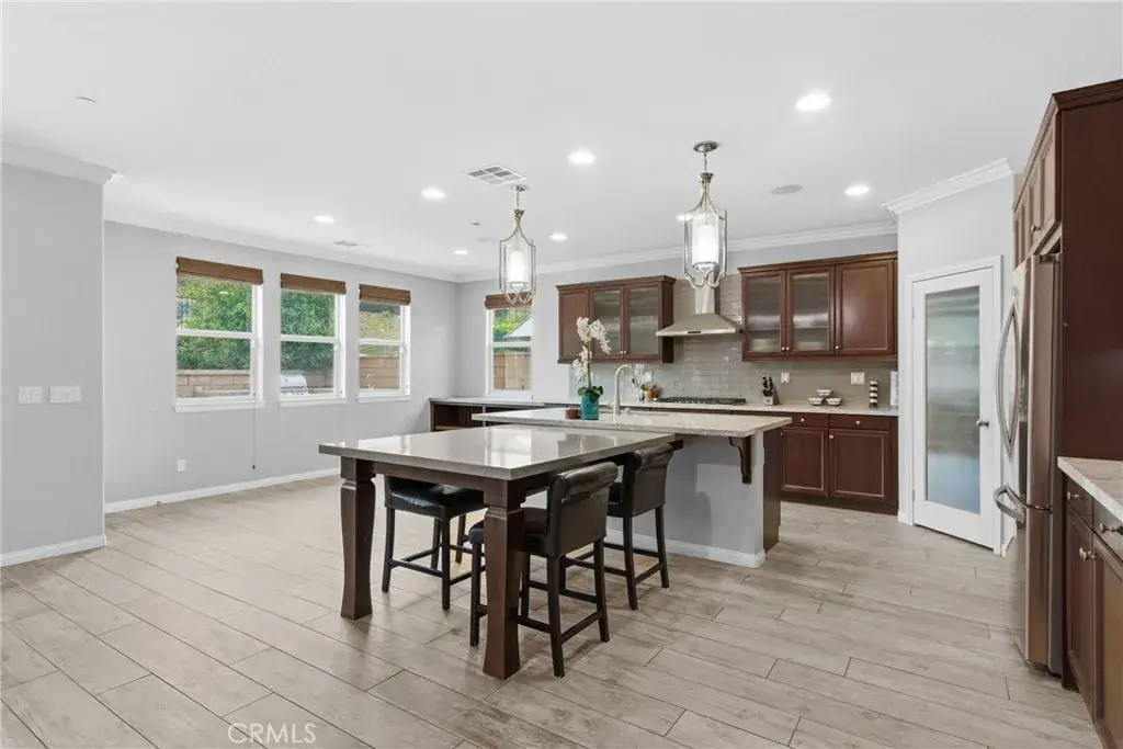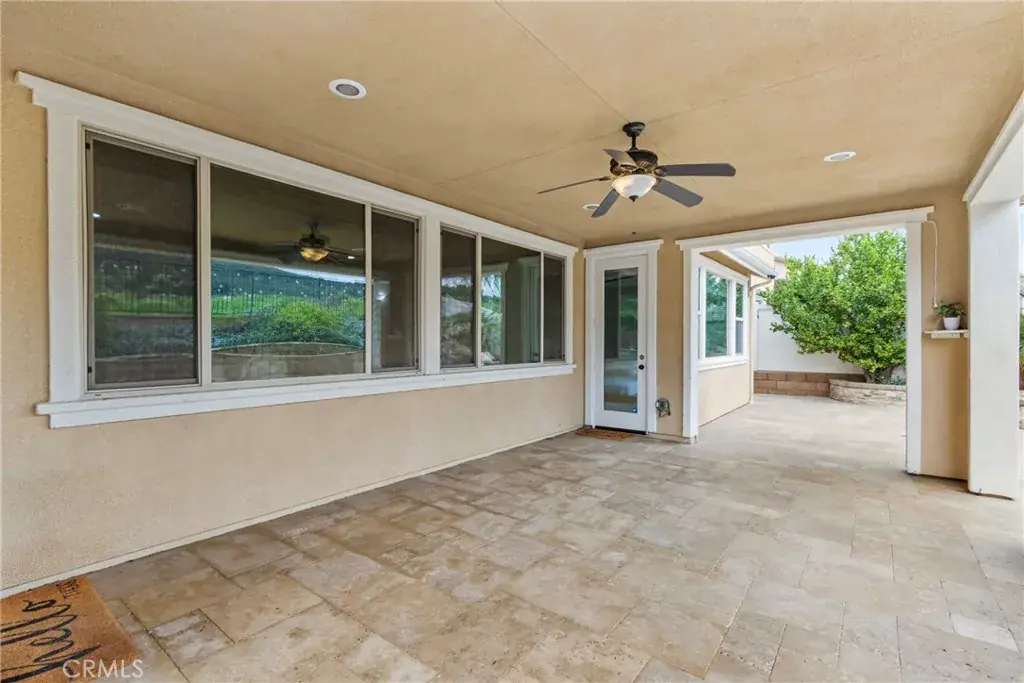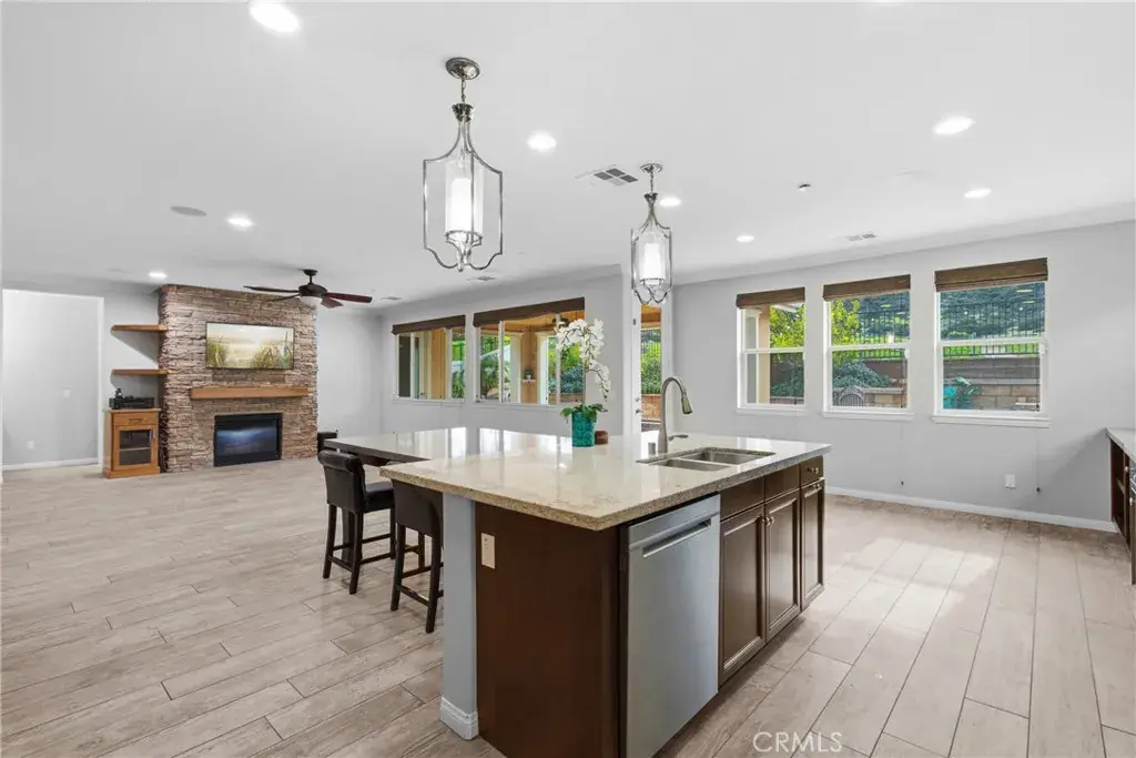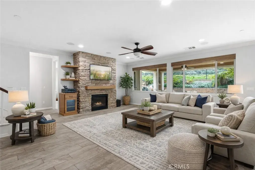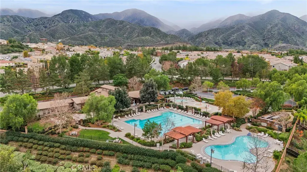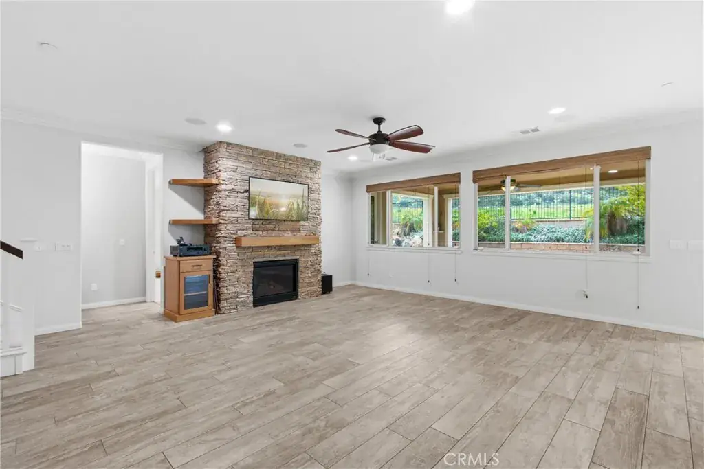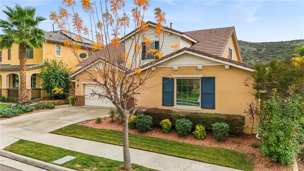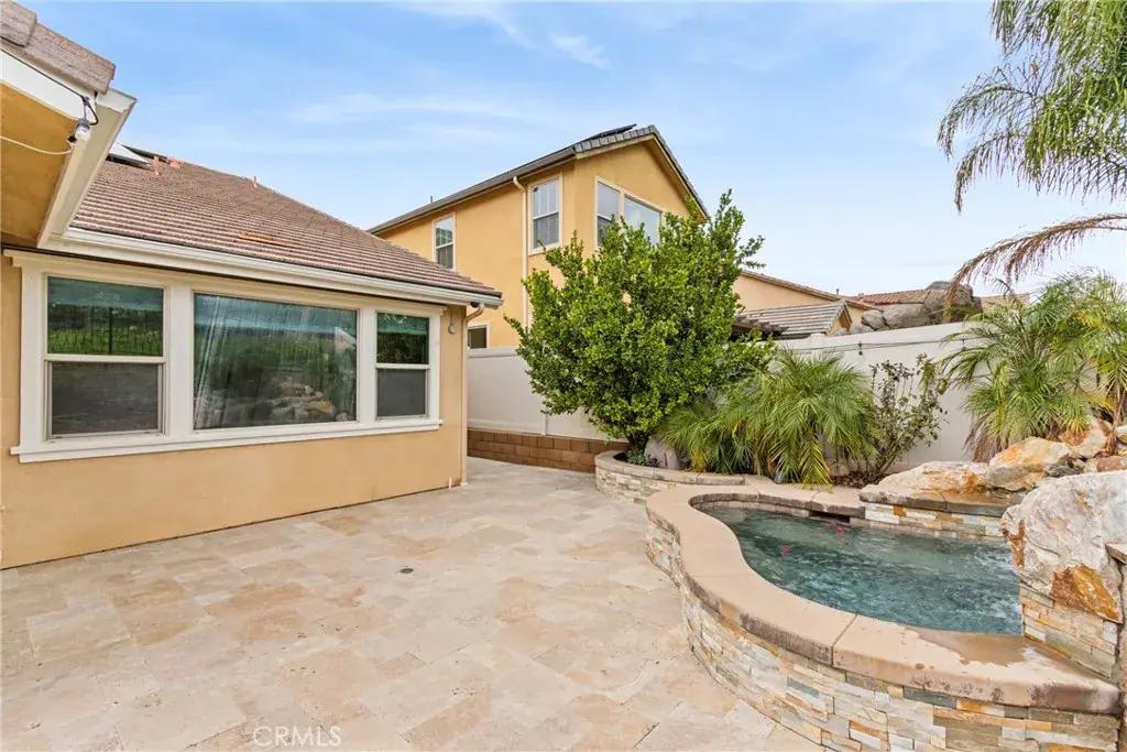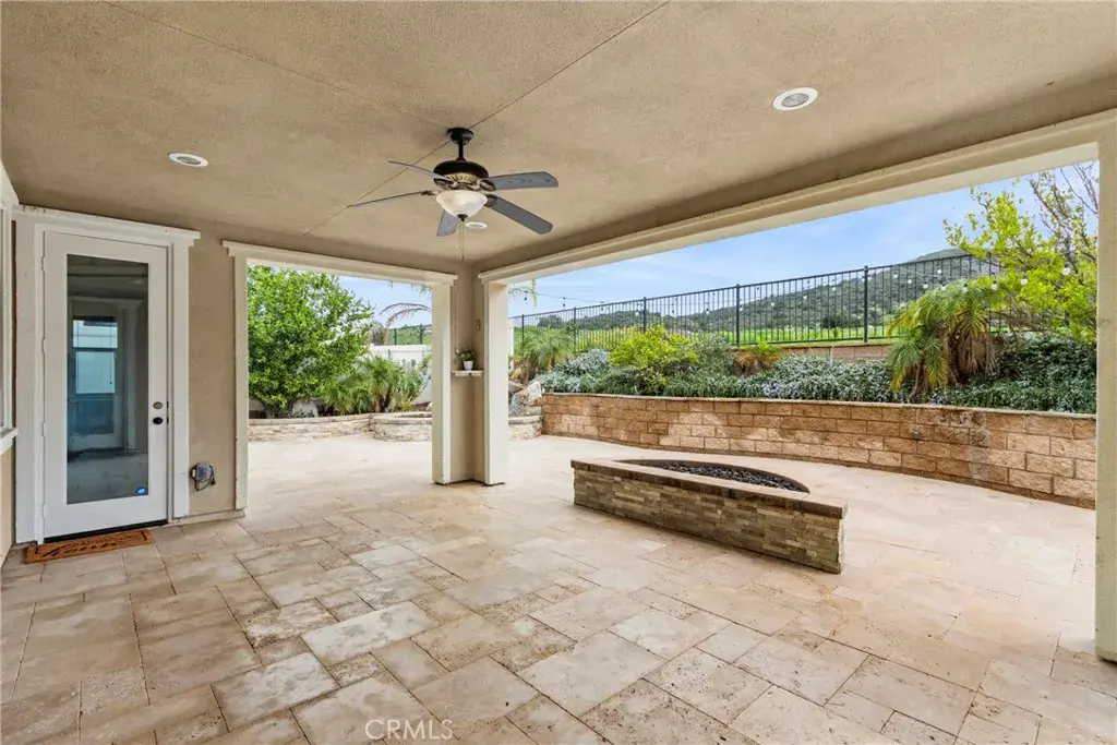 Upstairs, a spacious loft with bonus area creates the perfect space for a home office, tech hub, den, or media room, accompanied by an additional bedroom and full bath—providing separation without sacrificing flow. At the heart of the home, the open-concept kitchen is designed to impress and perform, featuring stainless steel appliances, built-in oven and microwave, granite countertops with classic subway tile backsplash, display cabinets with glass doors, and a generous T-shaped island ideal for gathering. A walk-in pantry, large dining area, and seamless connection to the family room make this space perfect for everyday living and entertaining alike. The family room is anchored by a cozy gas fireplace, enhanced with surround sound, ceiling fan, crown molding, and abundant natural light streaming through expansive windows. The primary suite is a true sanctuary with a spa-like bath offering a separate shower, oversized soaking tub, and French doors that open directly to the backyard—inviting peaceful mornings and relaxing evenings outdoors. Step outside and discover an entertainer’s dream backyard. Thoughtfully designed and fully hardscaped, it features an in-ground spa with a cascading waterfall, stacked stone fire pit, built-in BBQ, and a stunning California room finished with travertine tile, recessed lighting, and ceiling fan. Leased Solar. All of this is set against unobstructed, picturesque views of surrounding mountains and the national forest, providing rare privacy and an unforgettable backdrop. With its unique layout, designer finishes, resort-style outdoor living, and close proximity to everyday amenities, this home delivers comfort, flexibility, and lifestyle—wrapped into one truly special property. Homes like this don’t come along often—this is one you have to experience to appreciate.