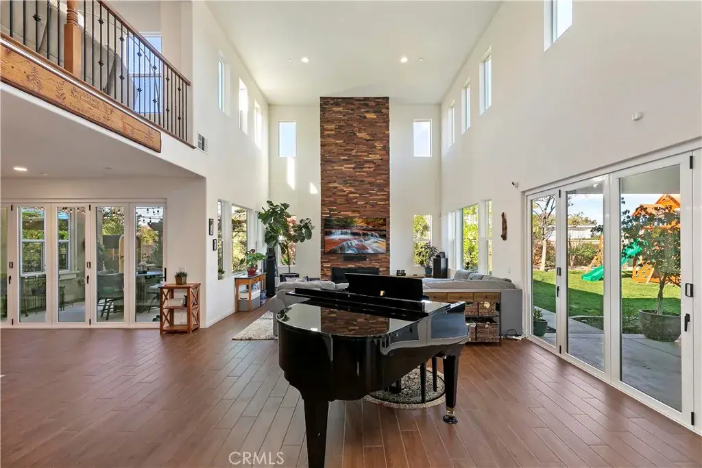 The open-concept floor plan is highlighted by walls of bi-fold glass doors that seamlessly connect indoor and outdoor living—ideal for large gatherings and entertaining. The family room with soaring 19-foot ceilings and an abundance of windows fill the home with natural light. The elegant formal dining room and family room create inviting spaces to relax or host intimate or grand occasions.