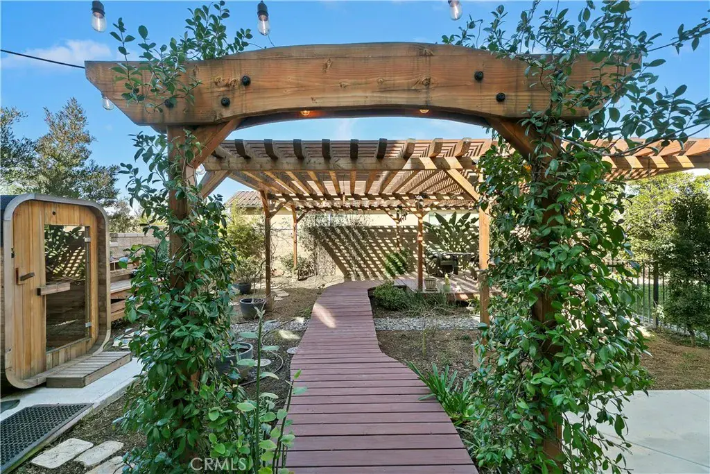 The expansive rear yard is an entertainer’s paradise, featuring a built-in barbecue island , Lion grill, kegerator, sink, fire table, sauna, cold plunge, stucco patio cover, pergola, private courtyard, fruit trees, and gated RV parking—all set on an impressive 18,295-square-foot lot.