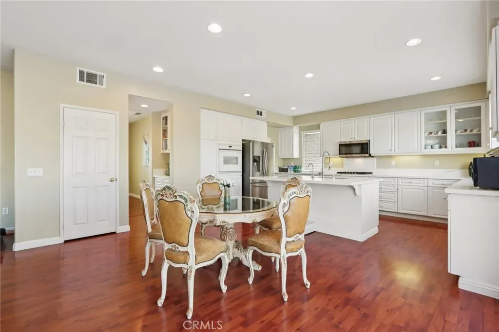 The home welcomes you with a freshly painted exterior and refined curb appeal, enhanced by updated low-maintenance landscaping, a mature pomegranate tree, and an efficient drip irrigation system designed for effortless upkeep. Step through the front door into a bright and inviting interior where high-quality flooring and an expansive layout create an atmosphere of sophistication. Just off the entry, the formal dining room provides an elegant setting for hosting holiday gatherings and memorable dinners. The living room is warm and inviting, centered around a beautiful fireplace that creates a natural focal point and a comfortable space to relax or entertain.