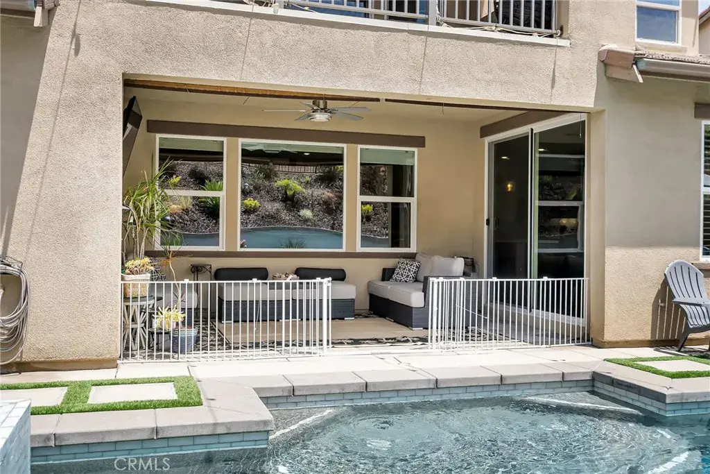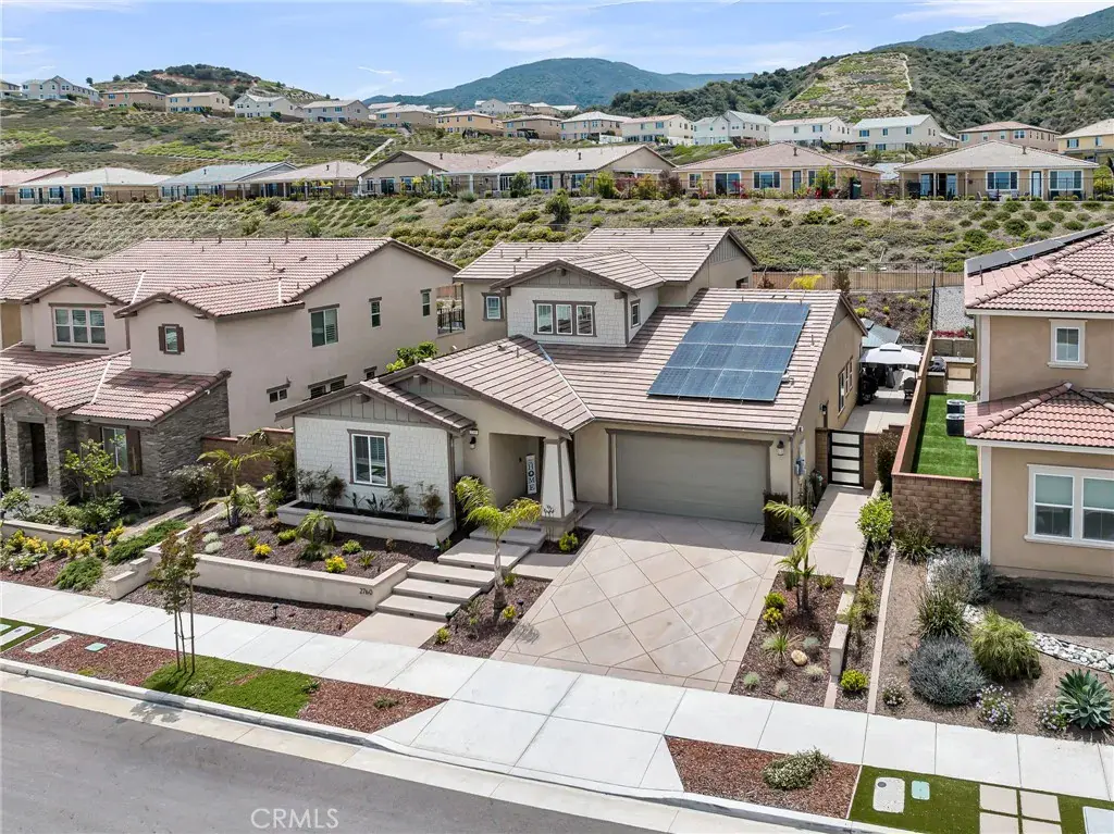 Welcome to the luxurious gated community of Sierra Bella in Corona! This pool home provides beautiful views of the Inland Empire, as well as high-end upgrades throughout. The entry sets the tone for the rest of the home. Natural light shines through and illuminates the white shiplap walls and helps light your way into the open living space. The oversized living room is central to the home and leads into both the kitchen and the downstairs primary bedroom suite. The kitchen is a chef’s dream! Including a central island, the kitchen has plenty of counterspace, cabinetry, high end appliances, step in pantry, and built in refrigerator. The dining room is open to both the kitchen and living room and leads to the backyard through the slider. 3 bedrooms are located on the first floor of the home including the aforementioned main bedroom suite. This tranquil owner’s suite is large and has peaceful views of the backyard pool and lights. The suite includes a bathroom with dual sinks, walk in shower, soaking tub, and large walk-in closet. The other two guest bedrooms on the other side of the first floor are spacious and have a full bathroom nearby. Lastly downstairs, you have a full laundry room. The stairs in this home include upgraded bannisters that help to make the space feel more open as well. Upstairs there is a massive loft, guest bedroom and full bathroom, as well as a covered back patio that overlooks the backyard. The backyard space has been thoughtfully designed with your entertainment in mind! The large pool and spa are the main attraction with peaceful spillways and fire feature to complete the right ambiance for your evening get-togethers. Relax and unwind while you lay out on the oversized daybed. Enjoy a formal dinner with family and friends under the gazebo or escape the sun in the covered California room just outside the home. This home provides peace and serenity with a touch of luxury! Located near the 91 Freeway and Fastrak entrance, this home is a commuter’s dream!
