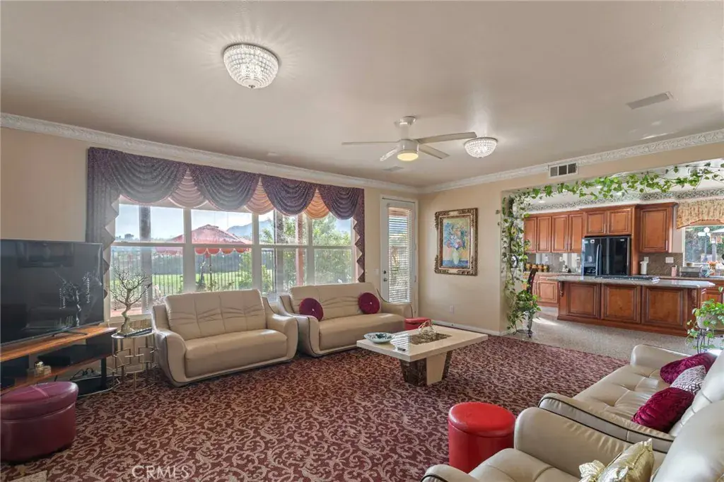 Situated in the scenic green foothills of South Corona, this expansive home offers nearly 4,000 sq. ft. of living space on an over half-acre lot in one of the area’s most desirable neighborhoods. With no rear neighbors, enjoy breathtaking mountain views and exceptional privacy year-round. There are 5 bedrooms upstairs and a full bedroom and bathroom on the main level provide excellent flexibility for guests or multigenerational living. The grand entry welcomes you with a dramatic foyer and chandelier, leading to a formal living room with fireplace and a formal dining room perfect for entertainment. The open family room connects seamlessly to the kitchen and breakfast nook, featuring a center island with countertop seating and ample storage. A dual staircase enhances both function and flow. Upstairs offers a thoughtfully designed layout, including Jack-and-Jill bedrooms and a spacious primary suite with a private balcony, ideal for enjoying panoramic mountain views. An additional main-level office or flex space with attached bath includes private access to both the front and backyard, making it ideal for a home office, studio, gym, or potential guest space. Outdoor living truly shines with a large, covered patio, BBQ island with sink and stove, and expansive yard space perfect for gatherings or relaxation. The property also includes a large double-door RV gate with ample parking for an RV, boat, or additional vehicles, plus a tool shed for extra storage. Additional highlights include dual A/C units and exceptional lot size, offering both comfort and functionality in a prime South Corona location. Close to schools, park and other amenities. Low HOA and taxes.