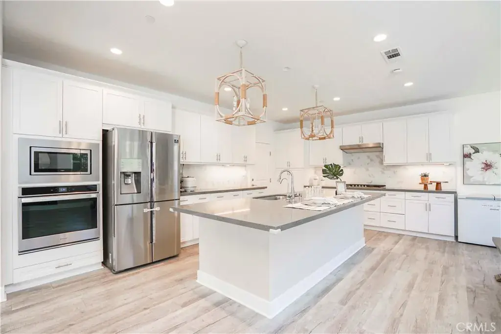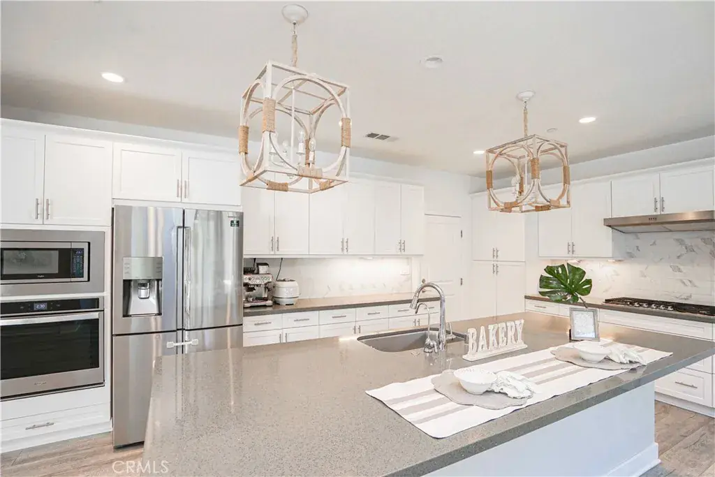 The gourmet kitchen is the centerpiece of the home, featuring a large center island, quartz countertops, and designer pendant lighting above the island, creating a soft and inviting ambiance. The adjacent dining area is enhanced by a beautiful decorative ceiling light, setting the tone for cozy dinners and memorable gatherings.