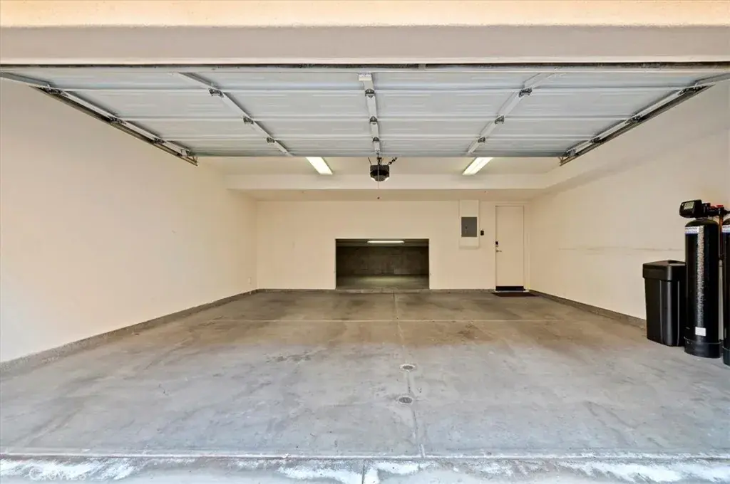 The gorgeous interior welcomes you with a dramatic entry and soaring 14-foot ceilings, leading to a step-down living room filled with natural light. The granite island kitchen is equipped with GE stainless steel appliances, white cabinetry, under-cabinet accent lighting, and a pantry. Plantation shutters, upgraded baseboards, a Nest thermostat, and a soft-water system add comfort and style throughout.