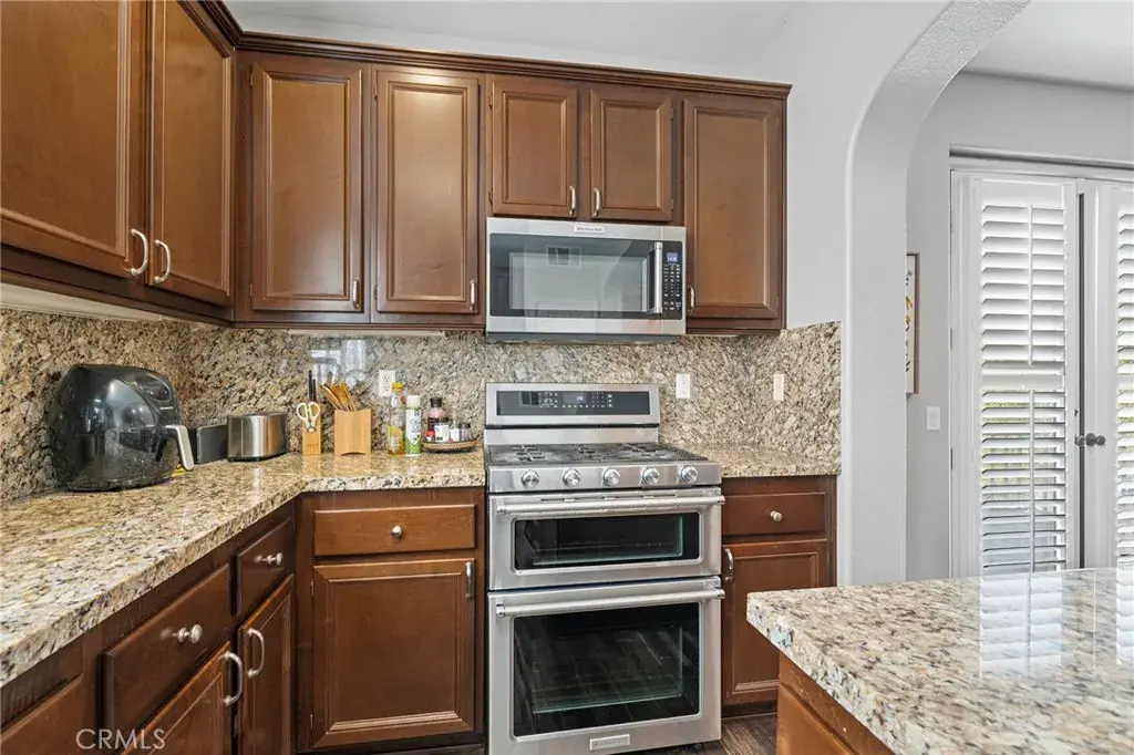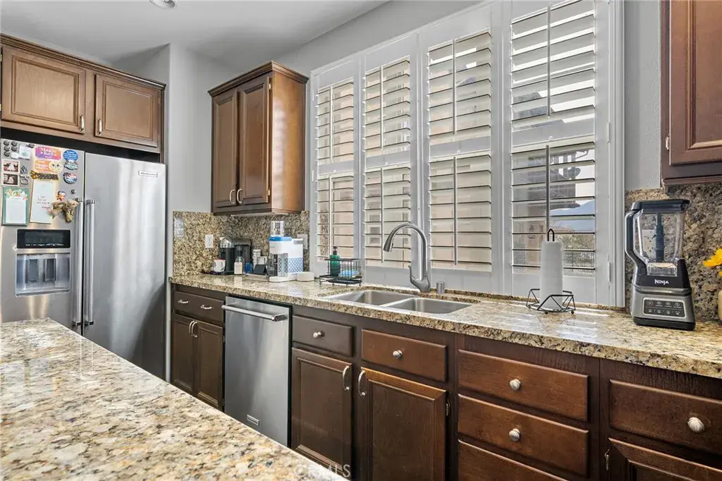 Welcome to this stunning 3-bedroom, 3-bath corner unit condo offering 1,875 sq ft of beautifully designed living space in the highly sought-after Dos Lagos gated Community in South Corona. This exclusive enclave features a resort-style pool and an unbeatable location just steps from premier shopping, dining, and theaters. The home opens to a spacious entry with 14-foot ceilings, leading to a light-filled, step-down living room that creates an inviting and open atmosphere. With hardwood and tile flooring, elegant plantation shutters and upgraded baseboards add timeless style throughout. The kitchen is upgraded with granite countertops, granite island perfect for everyday living and entertaining stainless steel appliances, ample cabinetry, and a pantry. Upstairs is the primary suite featuring a beautifully upgraded en-suite bath with travertine flooring, stone-detailed shower and soaking tub, and a spacious walk-in closet. Nearby are two additional well-sized bedrooms, a full bathroom, and ample linen storage. Additional highlights include an attached two-car garage with a Tesla charger and a conveniently located in-home laundry room. This exceptional condo offers luxury, comfort, and convenience in one of the area’s most vibrant communities.