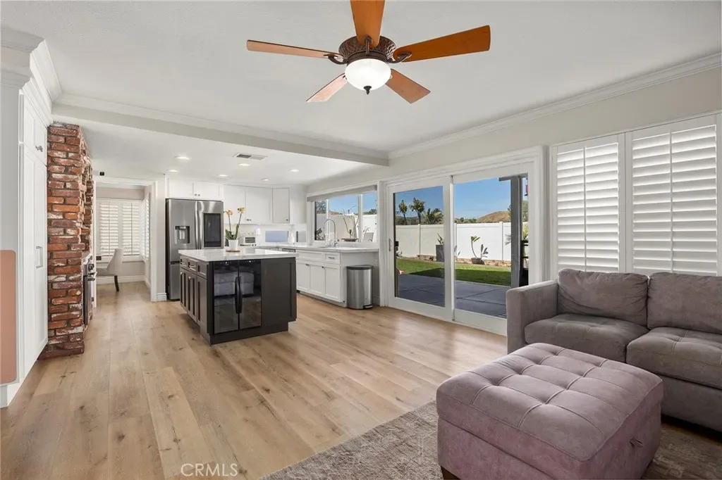 The airy, open floorplan and soaring vaulted ceilings keep the home bathed in natural light. The home glows with gorgeous newer luxury vinyl flooring. Chef’s Paradise: A recently remodeled expansive kitchen featuring sleek quartz countertops and a massive social island with a built-in wine fridge. High-end stainless steel appliances are perfectly complemented by a unique interior brick architectural feature above the range.