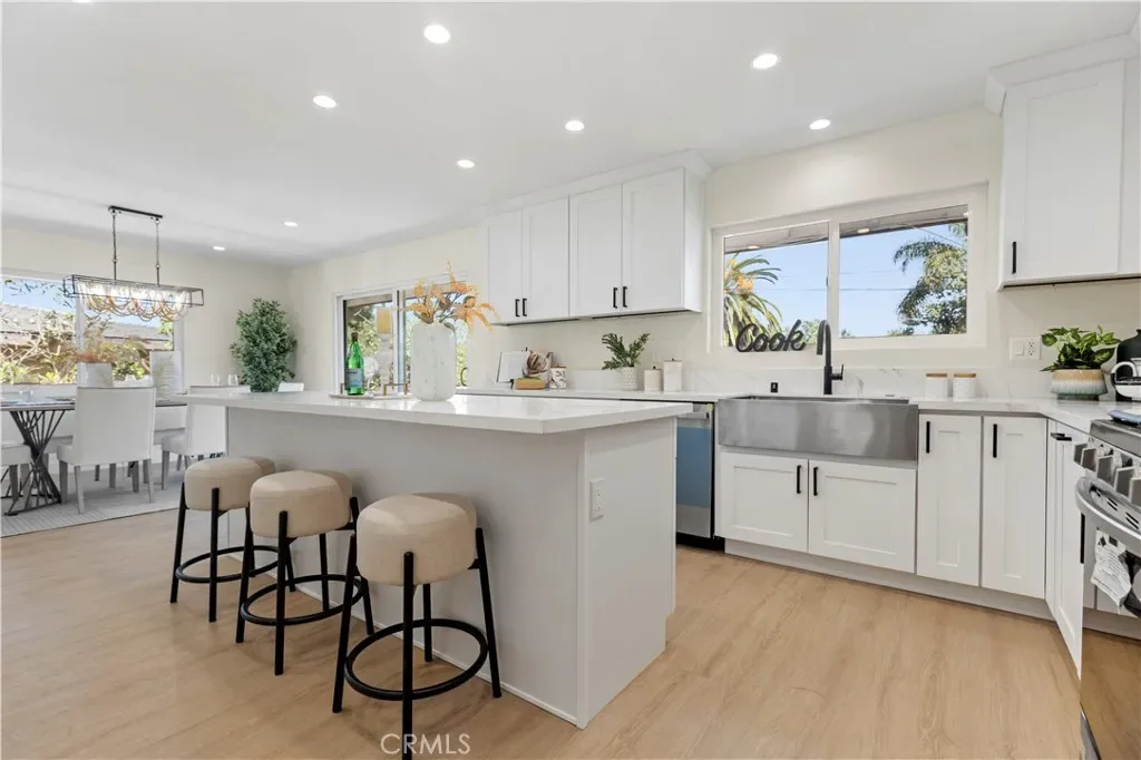 From the moment you enter, the home showcases a bright open layout enhanced by wide plank flooring, recessed lighting, and contemporary designer finishes. The spacious living room and dining area flow seamlessly into the beautifully updated chef’s kitchen, featuring abundant cabinetry, generous counter space, a center island with wine cabinet, embedded microwave and breakfast seating.