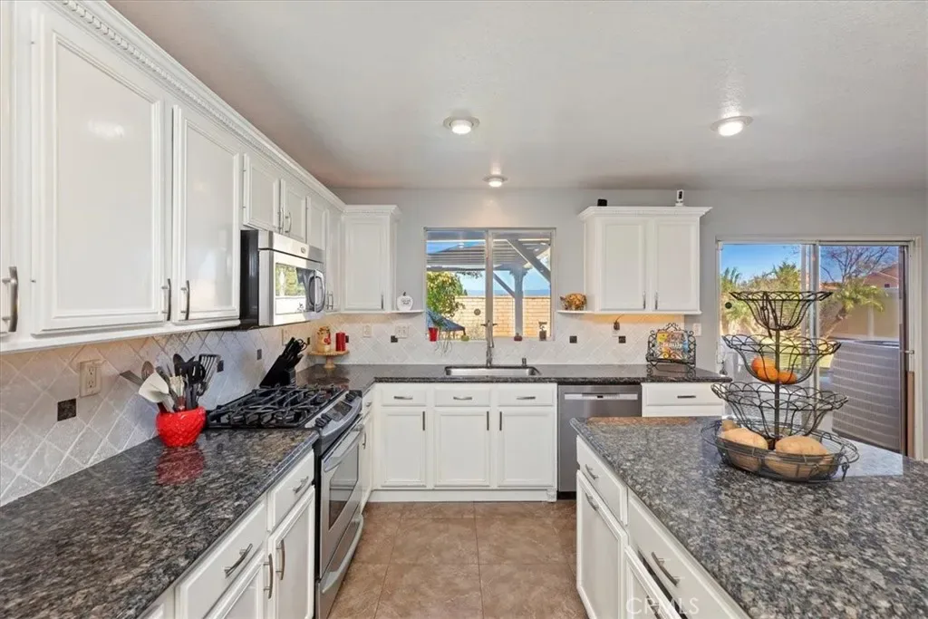 The island kitchen is a standout, showcasing gorgeous granite countertops, a travertine backsplash, white cabinetry, a 48-inch Thermador refrigerator, stainless steel appliances, a walk-in pantry, and upper and lower cabinet accent lighting.