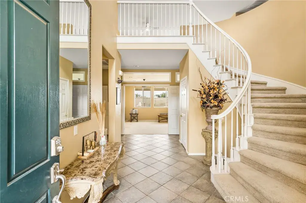 that leads to a bright, open entry featuring an elegant curved staircase. The