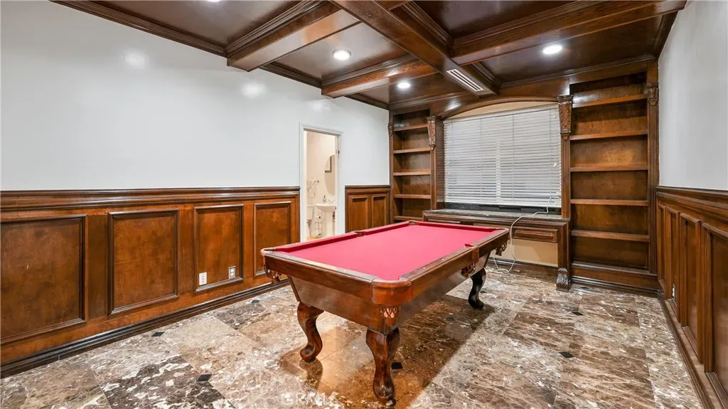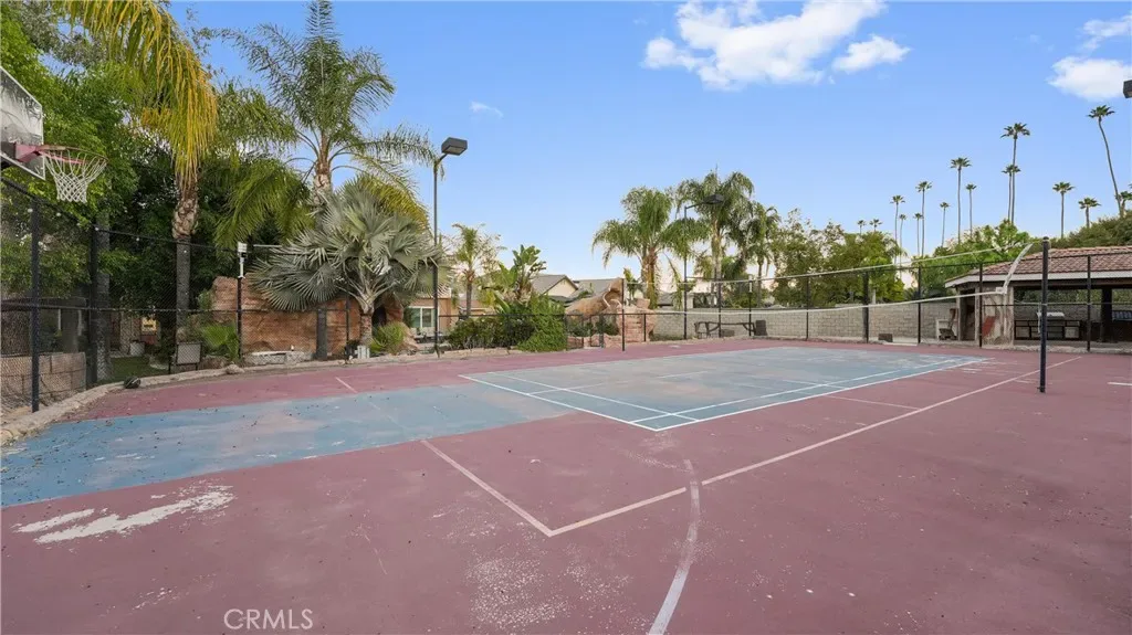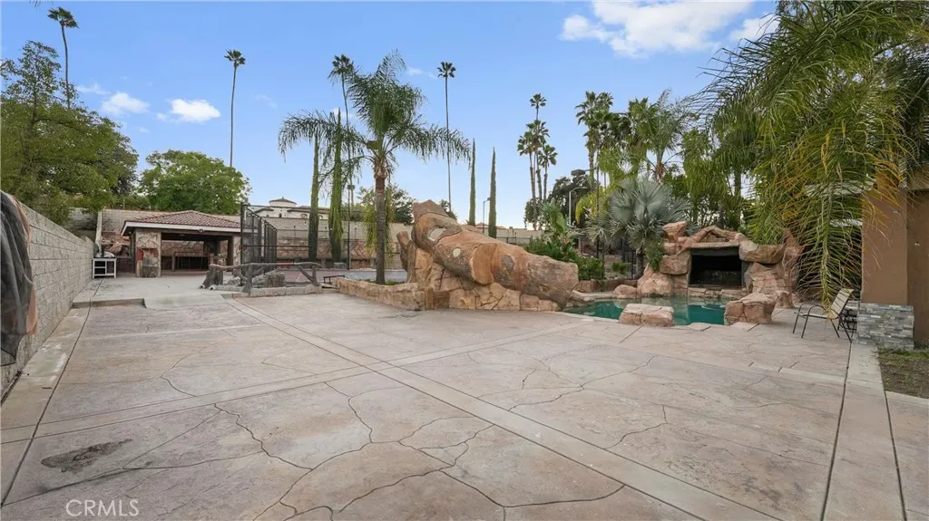 Step outside to a true resort-style backyard. The heated pool features a waterfall, slide, grotto, and attached spa. A built-in outdoor kitchen with barbecue, covered patios, gas firepit, and full outdoor bathroom create seamless indoor-outdoor entertaining. The lighted sport court accommodates basketball and tennis, enhanced by newer LED lighting. Mature fruit trees including guava, pomegranate, lemon, and lime add charm to the landscape.
