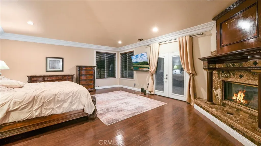 Upstairs, the primary suite is a private retreat with its own fireplace, balcony, dual walk-in closets, and a spa-inspired bath with Jacuzzi tub, separate vanities, and custom crown molding. Three additional bedrooms include attached bathrooms, two with walk-in closets and one ideal as a secondary upstairs primary suite.