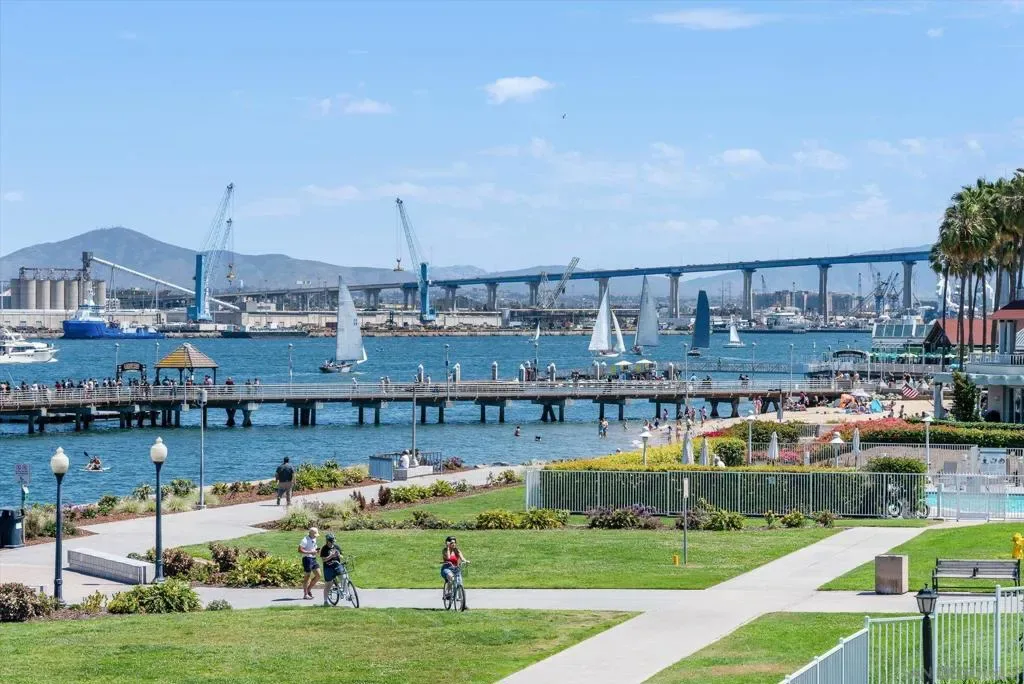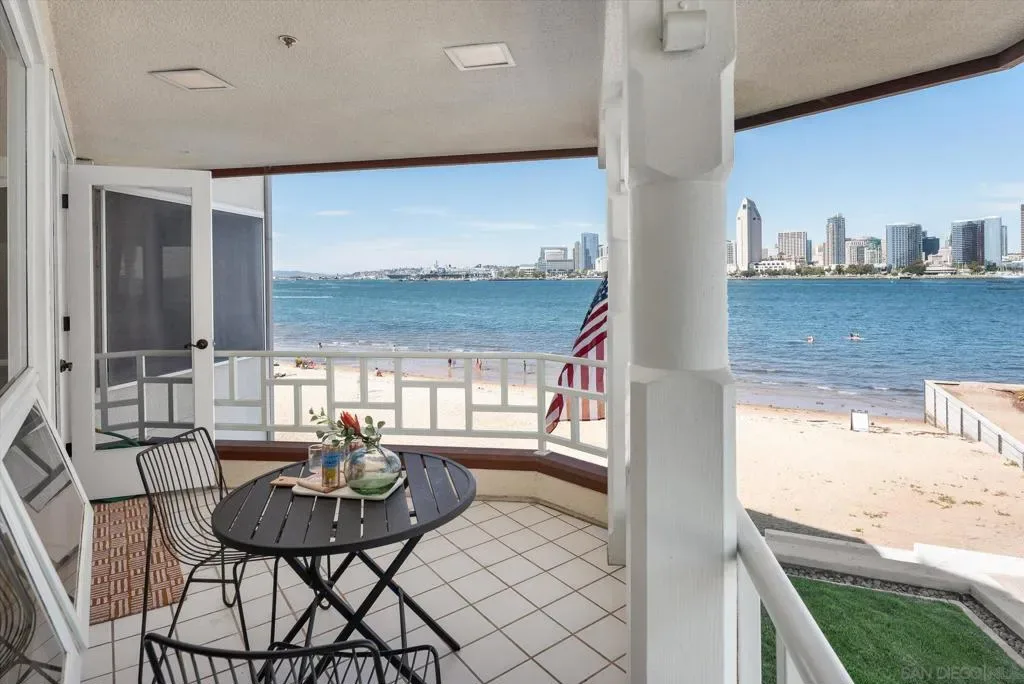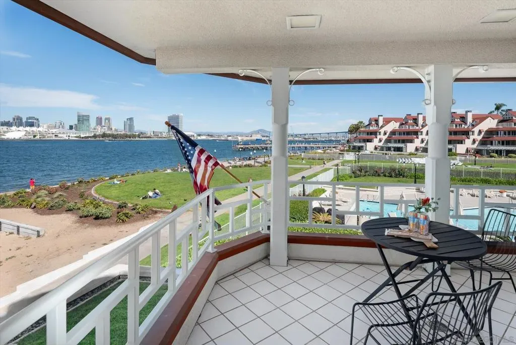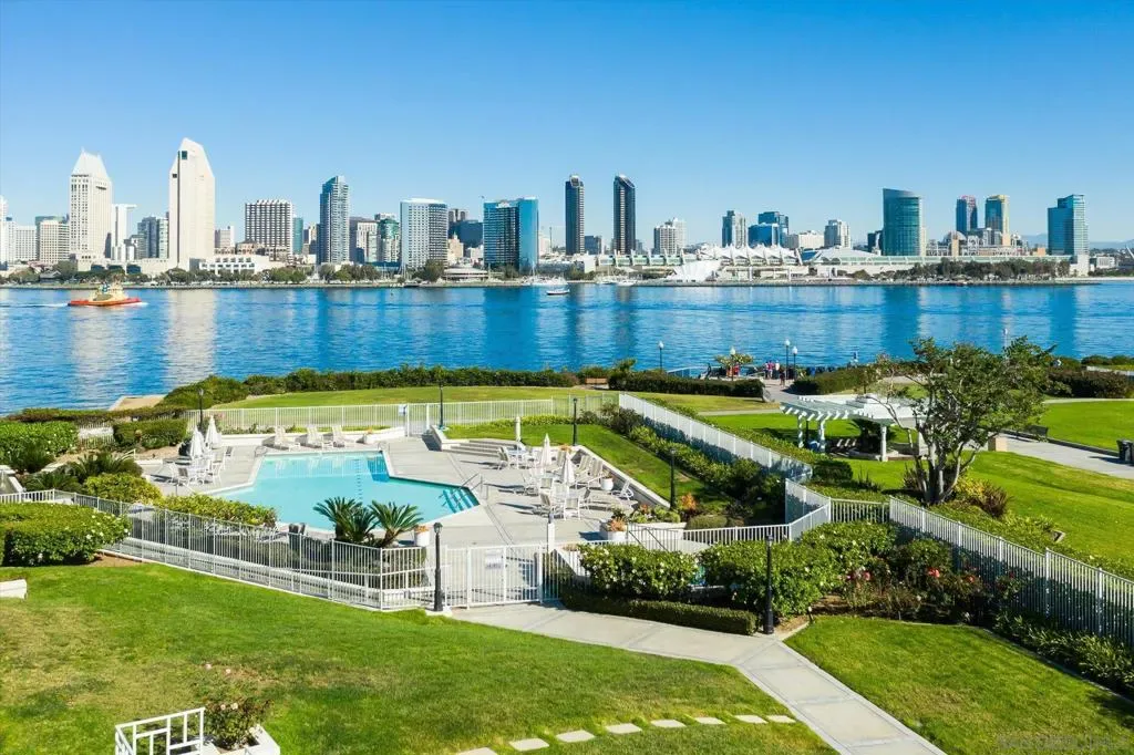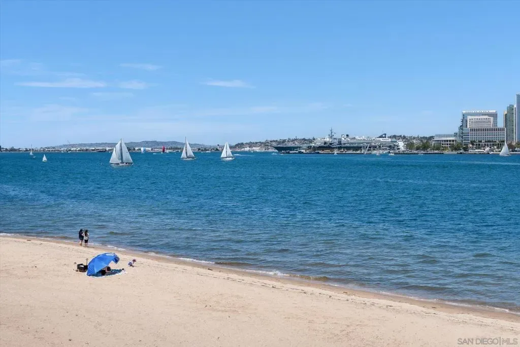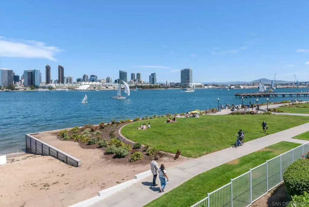 “No Kidding” panoramic full-on-water views of San Diego Bay & the Downtown Skyline. Gorgeously appointed with high-end designer finishes and textiles. SubZero, Dacor and Wolfe appliances. Luxurious & spacious primary bathroom with lovely built-in cabinetry, walk-in closets and ample storage. Beautiful tiled walk-in shower. Built in cabinetry thru-out with tastefully hidden Murphy bed in living room and new premium carpet. Exquisite marble flooring in half bath. Absolutely amazing water views from the kitchen, dining & living rooms. Enjoy fireworks, ships and boats saililng by from your covered patio terrace as well as having full access to the fun sandy beach and grass lawn right outside your unit. Hop on the ferry to the Gaslamp, Rady’s Shell, Padres PETCO park, Seaport Village & Port of San Diego. Stroll to Coronado restaurants & shopping. The Landing offers a wonderful outdoor heated pool, fitness center, lovely gardens & landscaping. 2 underground parking spaces right next to the elevator. Truly an opportunity of a lifetime! This is an exceptional home with breathtaking views that rarely comes up on the market. A stunning & rare beauty! This is truly an amazing place to live. The full panoramic views of San Diego Bay are absolutely breathtaking and seductive! Enjoy watching ships and boats sail through the harbor from your private terrace. Hop onto the ferry for dining & shops at the famous Gaslamp, or enjoy some fantastic live music entertainment at the outdoor Rady’s Shell or take in a San Diego Padres game at PETCO park. Easy peezy because it is all right there in your backyard. This luxurious unit has gorgeous finishes. Wait till you see the stunning marble flooring in the half bath. BEEE-U-TI-FUL! The primary bathroom boasts a beautifully tiled walk-in shower, lovely cabinetry with ample storage and walk-in closets. New carpet and a Murphy bed tastefully built-in to the living room cabinetry. The Landing offers a heated outdoor pool right on the water and a fitness center, meeting rooms and lovely landscaped grounds including a gorgeous rose garden outside the entrance. 2 parking spaces are located right as you come out of the elevator in an underground garage. This is truly a very special place. The views are intoxicating!