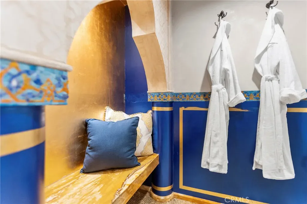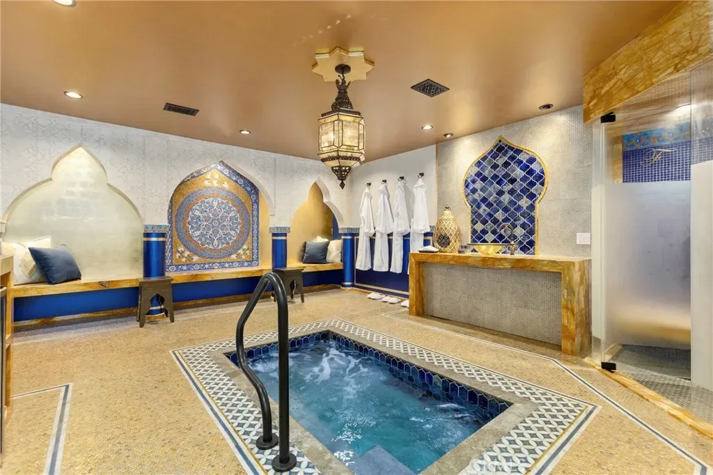 Additional highlights include a private Turkish hammam spa with steam room and jacuzzi, solar panels, and an expansive three-car garage including limousine-length parking and workshop space.