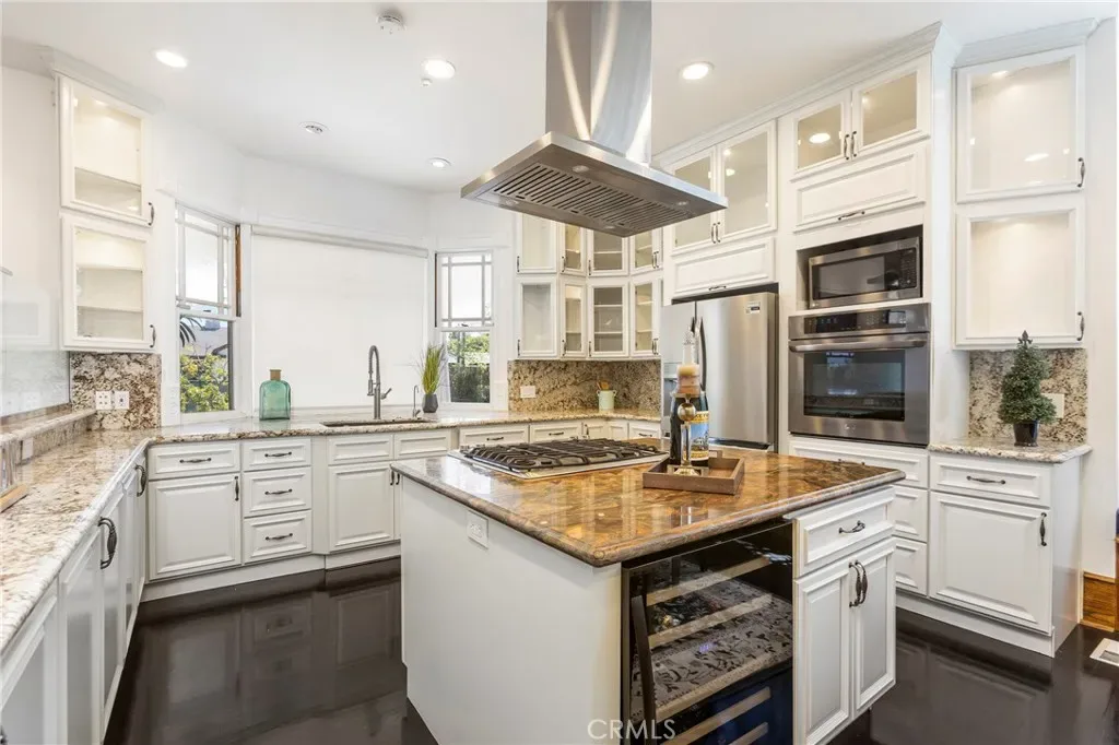 Inside, soaring vaulted ceilings and walls of windows fill the home with natural light, while beautiful stained glass details add artistry and charm throughout. The updated chef’s gourmet kitchen features granite countertops, stainless steel appliances, wine refrigerator, center island, and walk-in pantry, opening seamlessly to generous dining and living areas designed for both everyday living and entertaining.