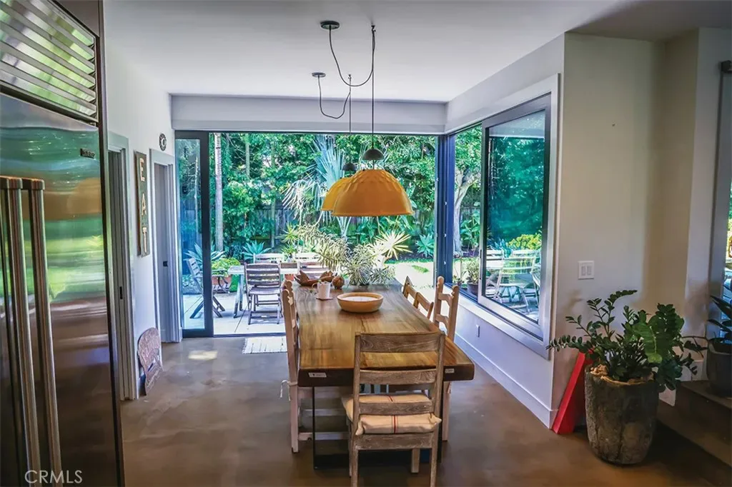 Located in the premier Heights neighborhood of Costa Mesa, this stunning mid-century contemporary home seamlessly blends timeless architecture with modern upgrades. This four bedroom, two bathroom residence was thoughtfully remodeled and expanded in 2017 to maximize functionality and luxury. The home features a gourmet kitchen anchored by polished concrete floors and premium stainless steel appliances, including a six-burner Thermador range with double ovens and a 42-inch Sub-Zero refrigerator. This culinary space flows directly into the dining room, where an oversized custom pocket sliding door reveals a beautifully landscaped, private backyard designed for sophisticated outdoor entertaining.