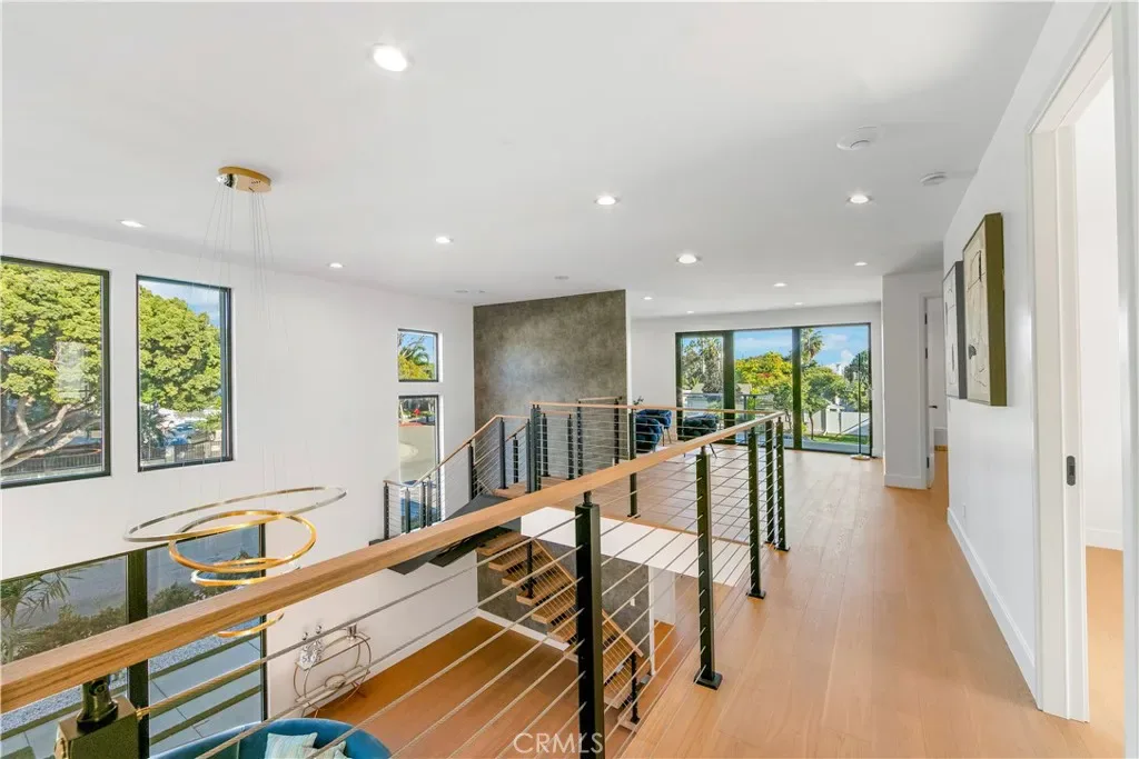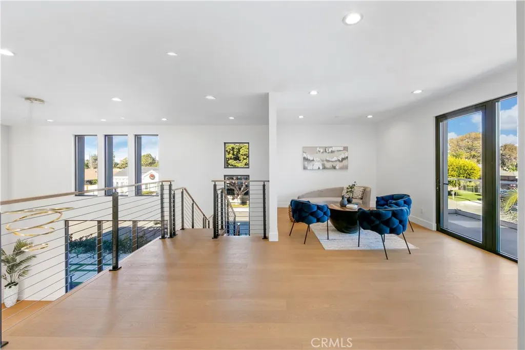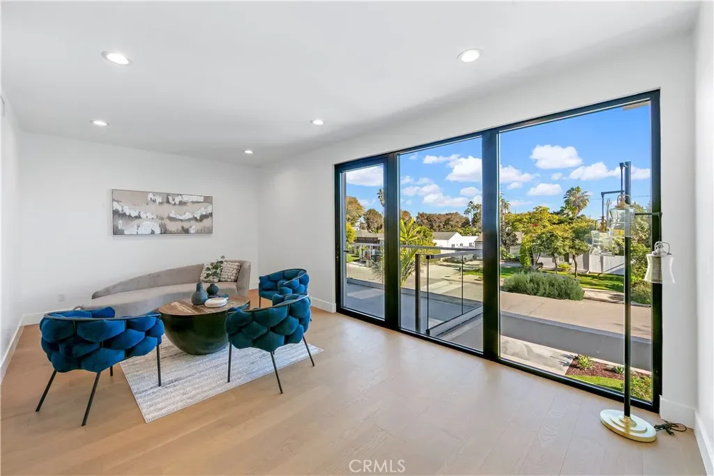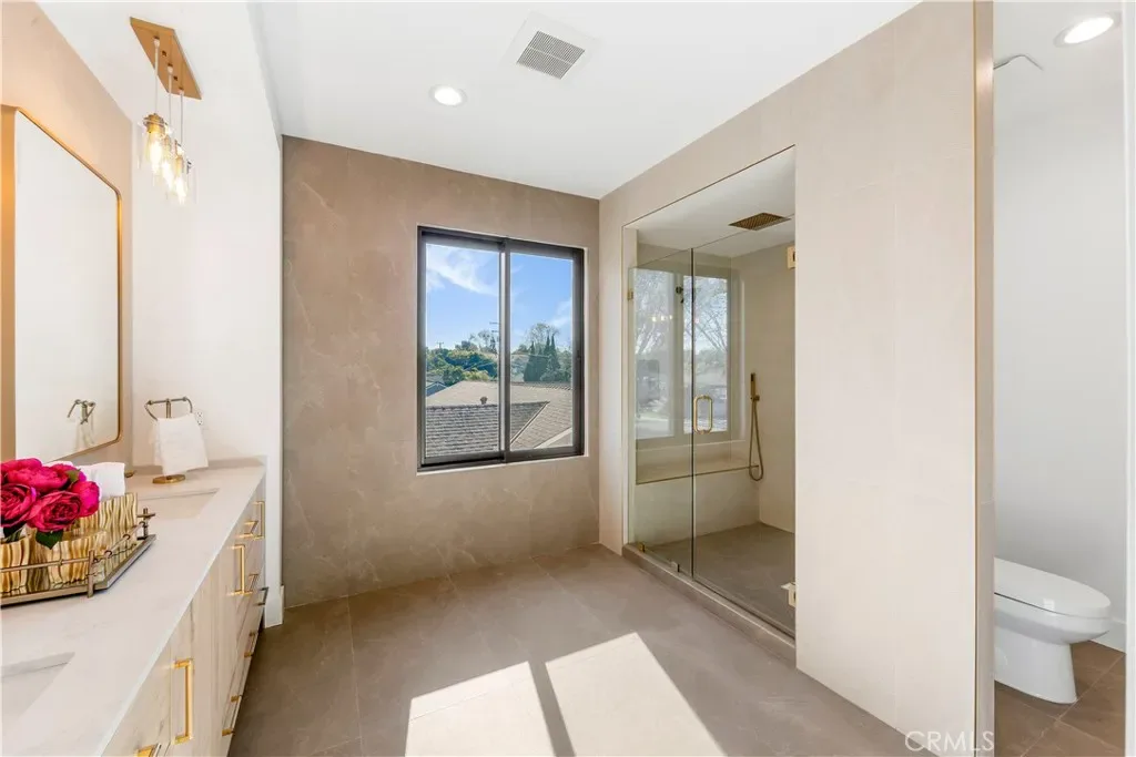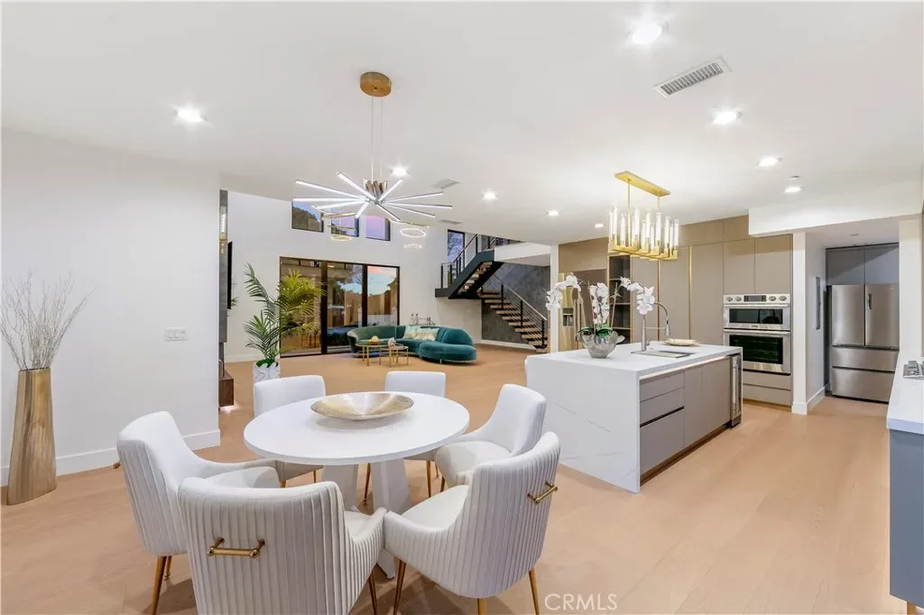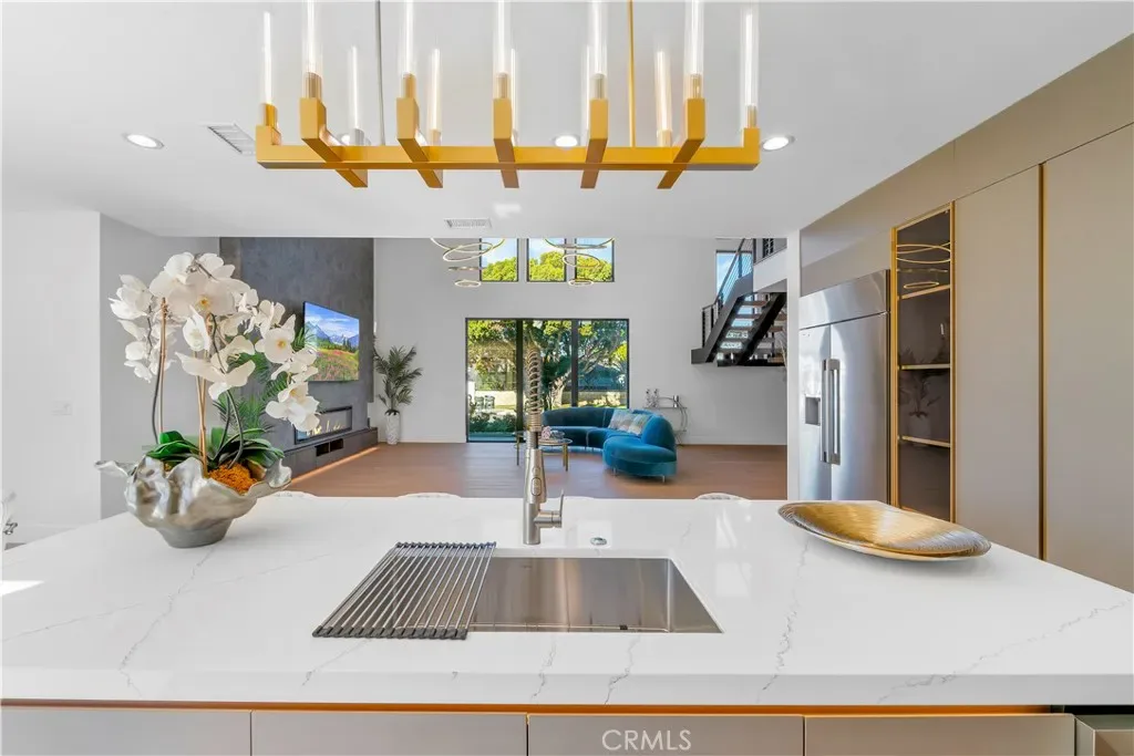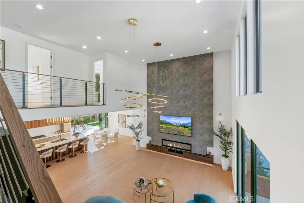 As you step inside, you are immediately greeted by soaring 20 foot ceilings and expansive windows that flood the home with natural light. The open concept layout creates a seamless flow between the living, dining, and kitchen spaces, ideal for both everyday living and entertaining. The chef’s kitchen is equipped with state of the art appliances, custom cabinetry, and sleek quartz countertops, complemented by a butler’s pantry and a secondary prep kitchen, perfect for hosting gatherings or catering larger events.